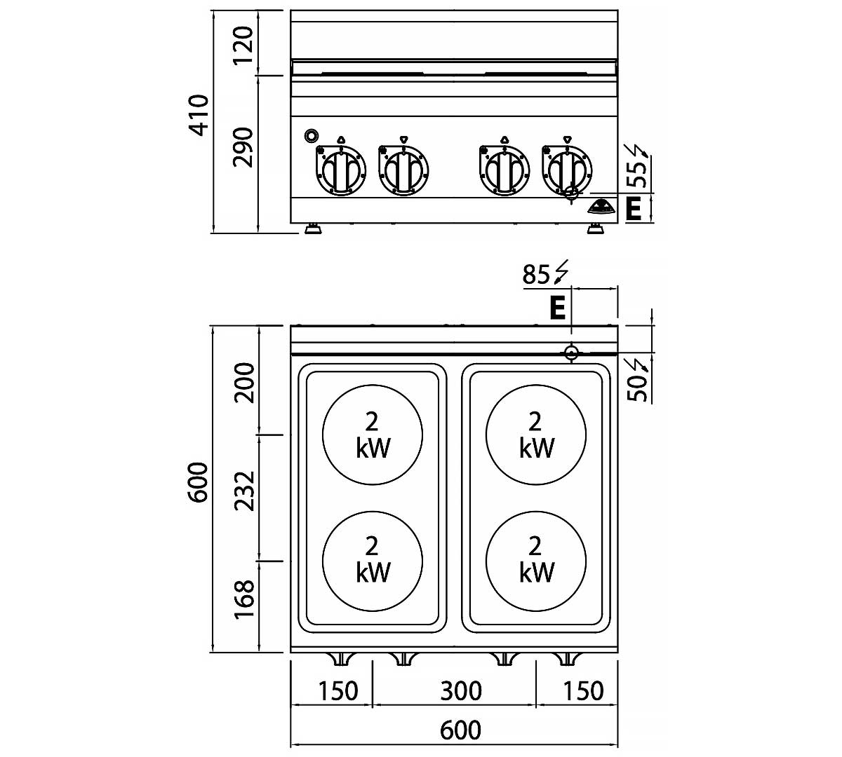 La Cocina E6P4B pertenece a la Serie Plus 600, con 4 placas eléctricas de 2 kW cada una para uso intensivo y modularidad total.