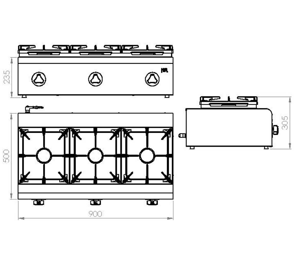 Cocina de sobremesa con tres fogones de alto rendimiento calorífico. Fabricada en acero inoxidable, con parrilla superior y termopar de seguridad. Tiene una potencia de 16,5 kW. La toma de gas está ubicada en la parte trasera.