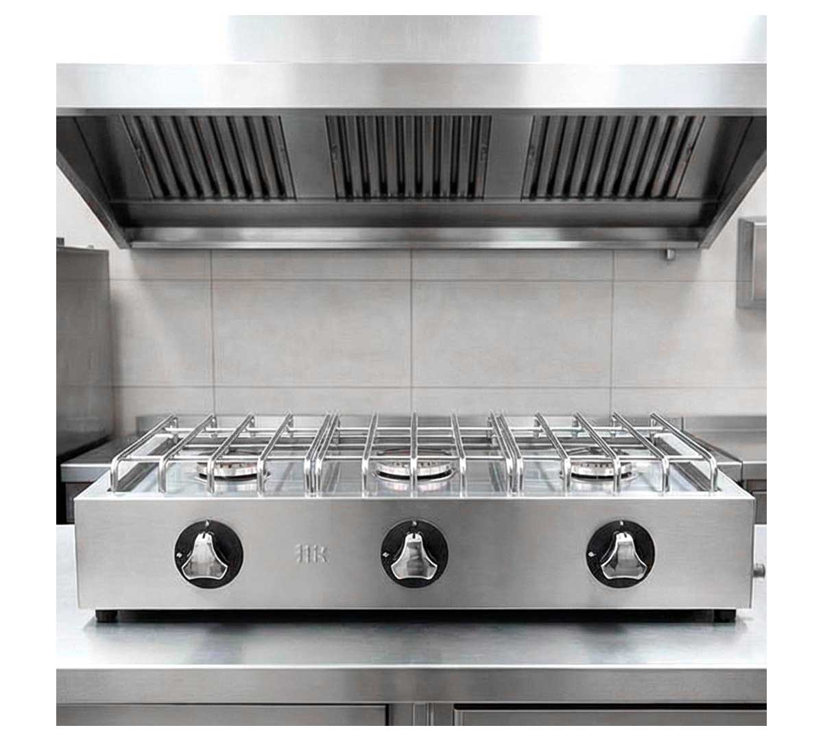 Cocina industrial para la preparación de alimentos de forma rápida. Fabricada en acero inoxidable, con parrilla extraíble en acero cromado y tres fogones. Dispone de toma de gas intercambiable de lado.