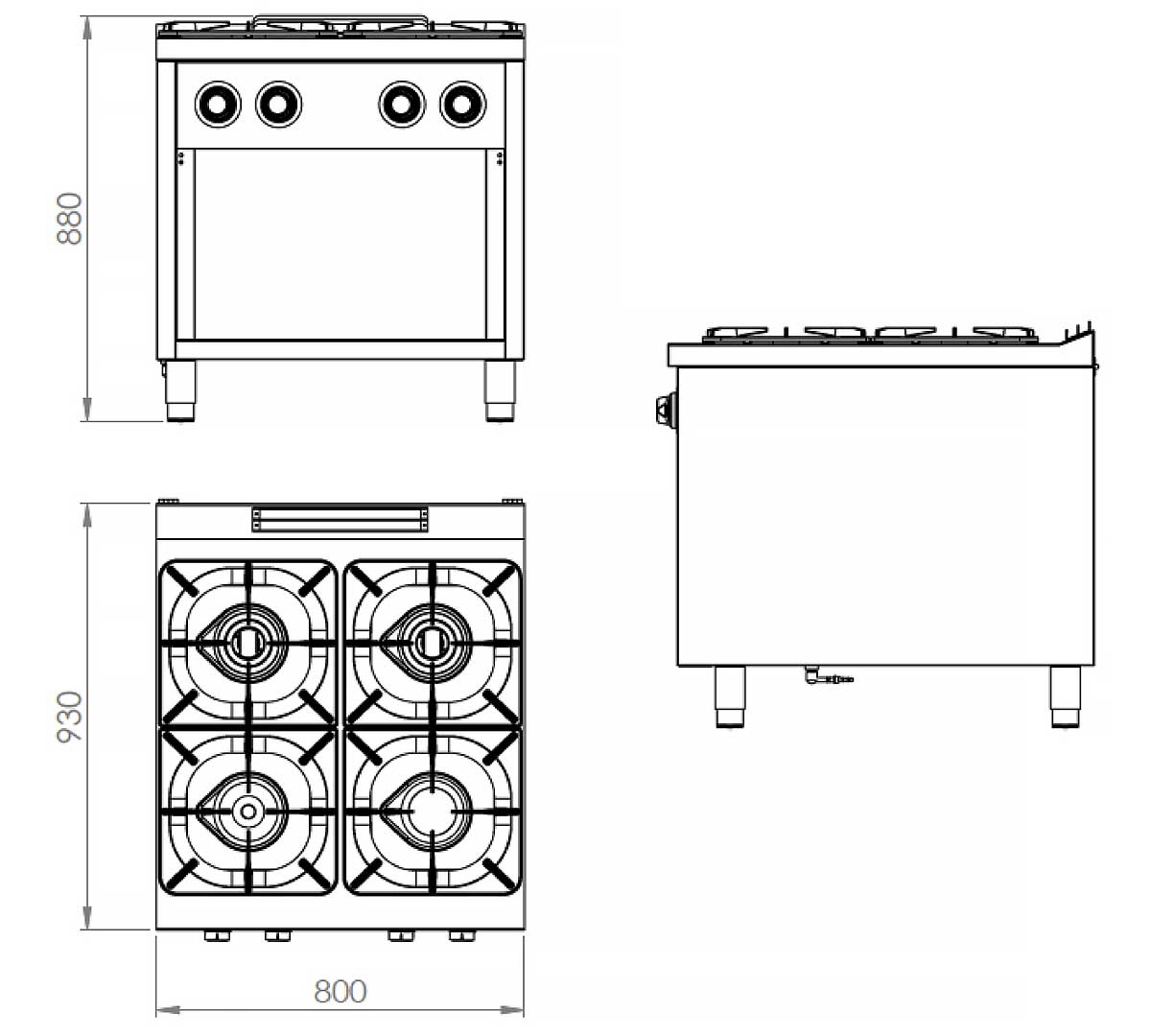 Este equipo, también conocido como cocina de 4 fuegos o fogones industriales, destaca por su construcción íntegra en acero inoxidable AISI 304, lo que garantiza una durabilidad excepcional y una fácil limpieza, incluso en los servicios más intensivos.