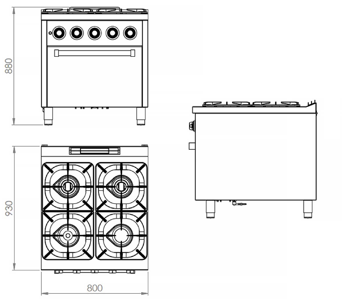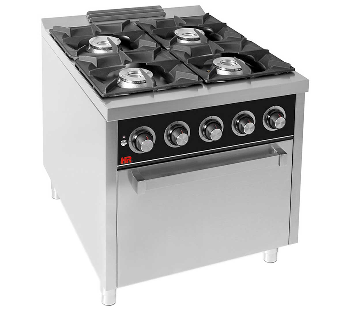 Cocina a gas de 4 fuegos con horno eléctrico, fabricada en acero inoxidable AISI 304, con quemadores de alto rendimiento, encimera embutida y horno gastronorm 2/1 de fácil limpieza.
