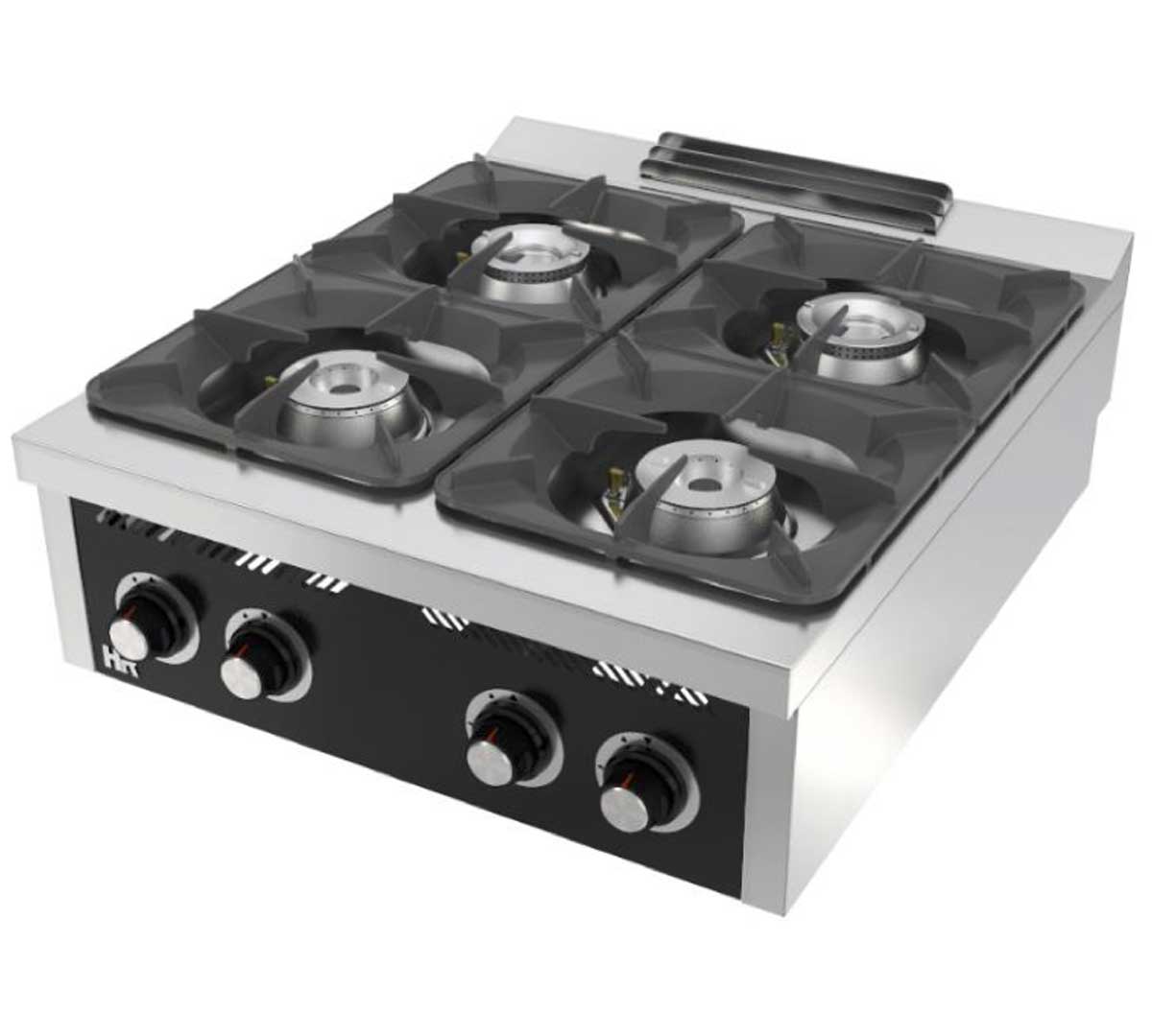 Cocina de gas de sobremesa con 4 fuegos de alto rendimiento, cuerpo y encimera en acero inoxidable AISI 304, parrillas de fundición, llama piloto y termopar de seguridad. Fácil mantenimiento y limpieza.