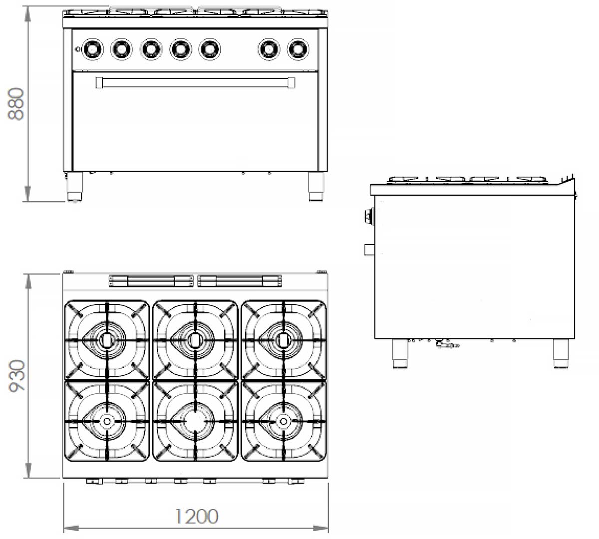 Cocina de 6 fuegos a gas con horno maxi, fabricada en acero inoxidable AISI 304, encimera embutida, válvula termostática, sistema de seguridad por termopar y encendido automático.