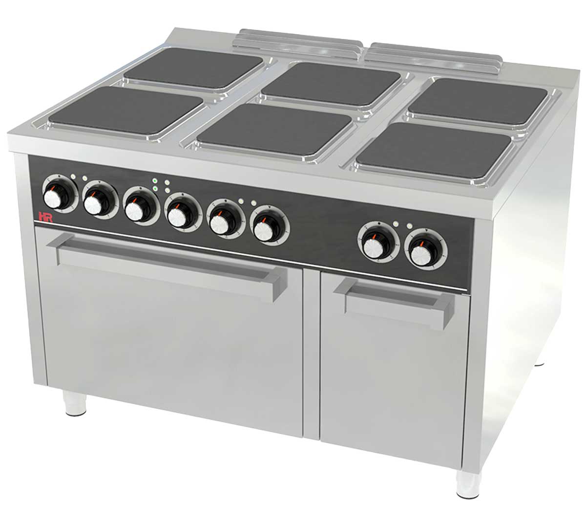 Cocina eléctrica de 6 placas con horno, fabricada en acero inoxidable AISI 304, control de temperatura regulable y horno gastronorm con grill. Ofrece alta potencia y facilidad de limpieza.