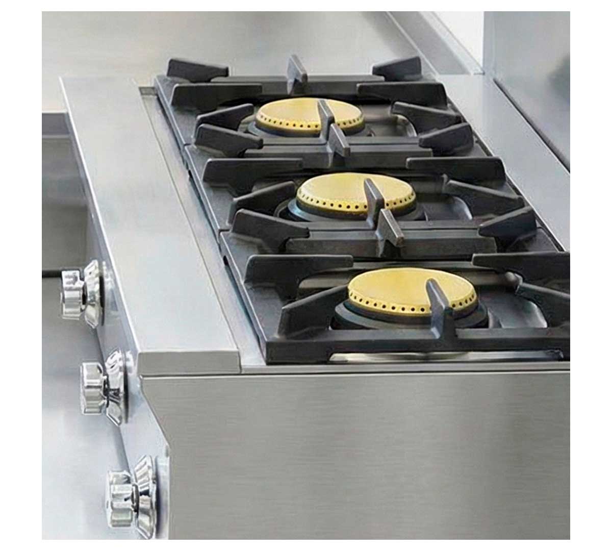 Está equipada con 3 fuegos de 6 kW, quemadores de 120 mm, parrillas de fundición y corona de latón. Su diseño modular permite combinarla con otros módulos para formar una línea de cocción profesional.