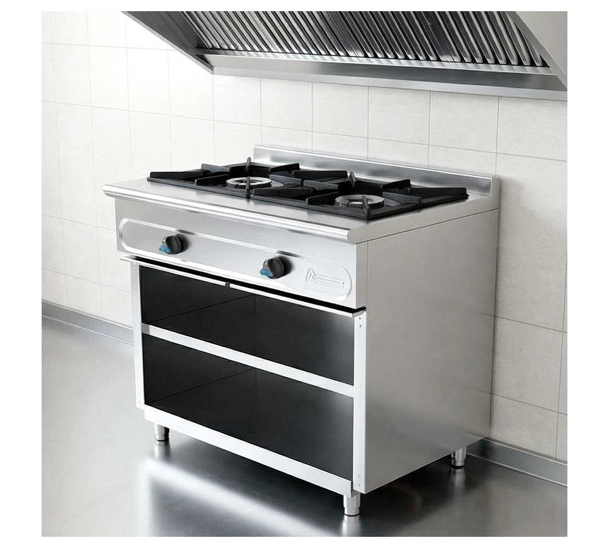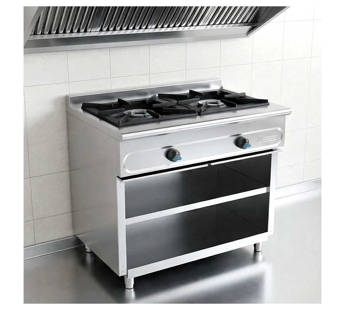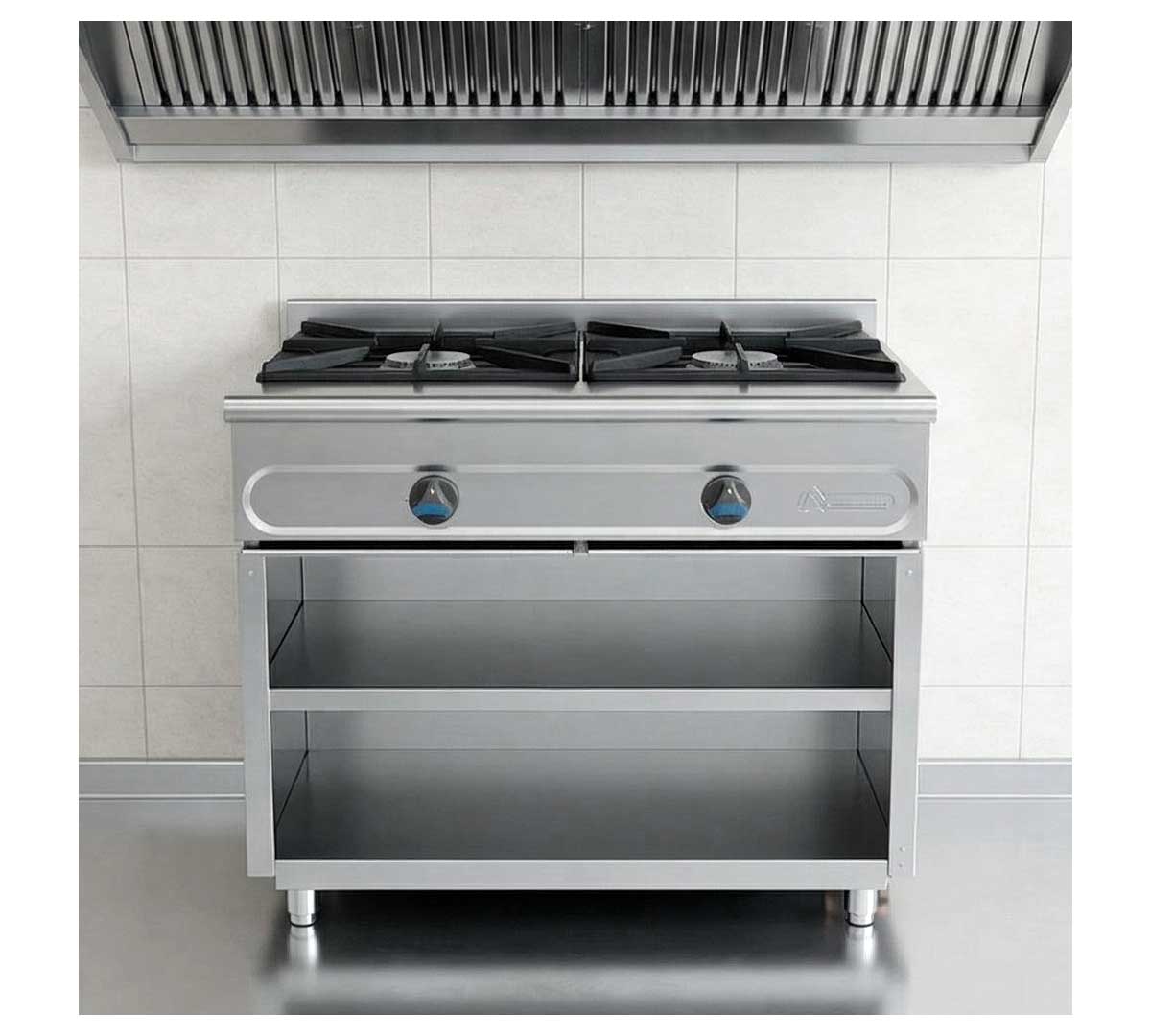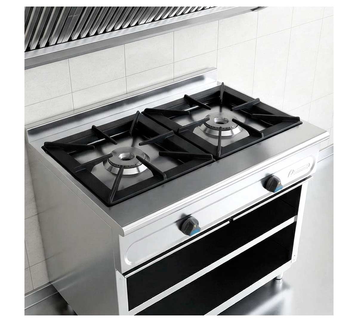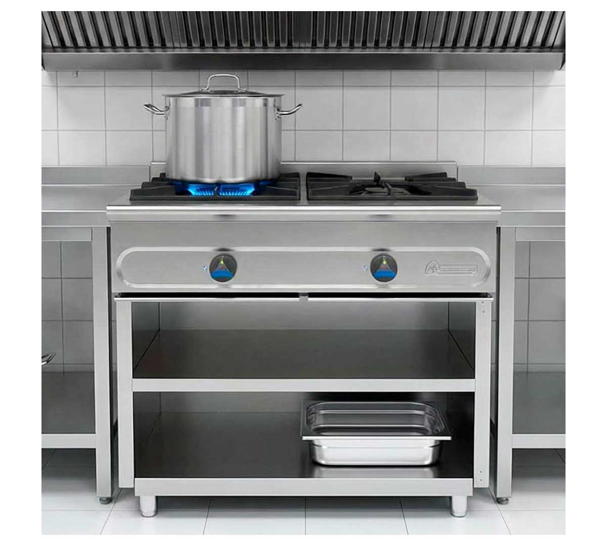 Cocina a gas de dos fuegos con estructura en acero inoxidable, válvula de seguridad, parrillas esmaltadas y entrepaños. Ofrece alta potencia y robustez para un uso intensivo diario.