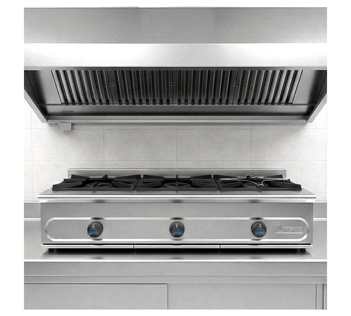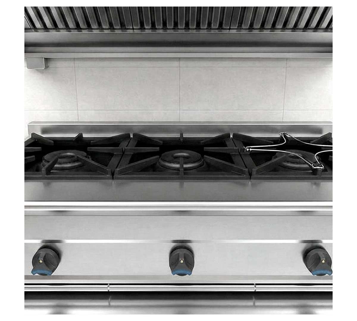 Cocina a gas de alta potencia con estructura en acero inoxidable, quemadores de gran rendimiento, válvula de seguridad y bandeja recoge grasas. Diseño robusto y fácil limpieza para uso intensivo.