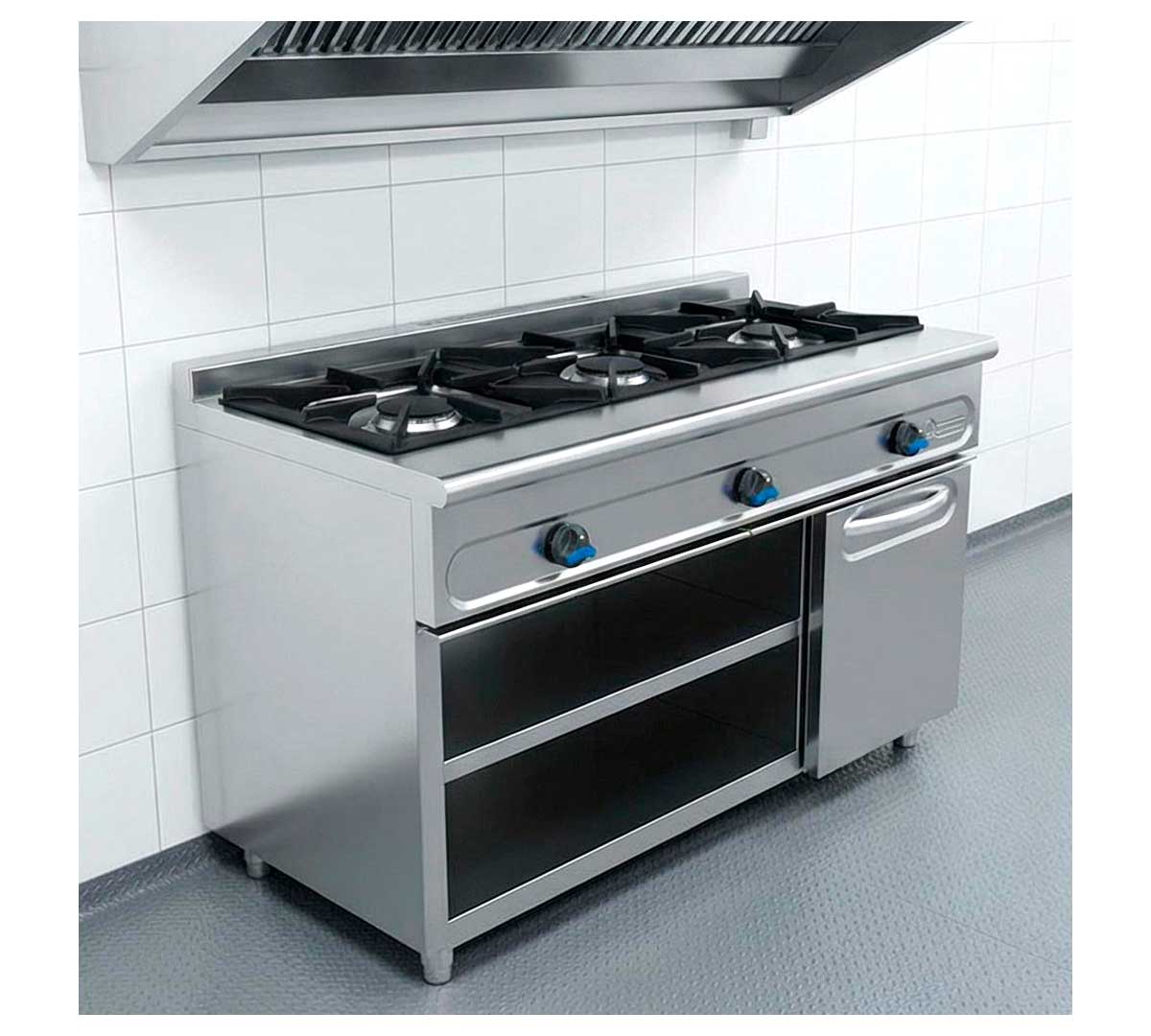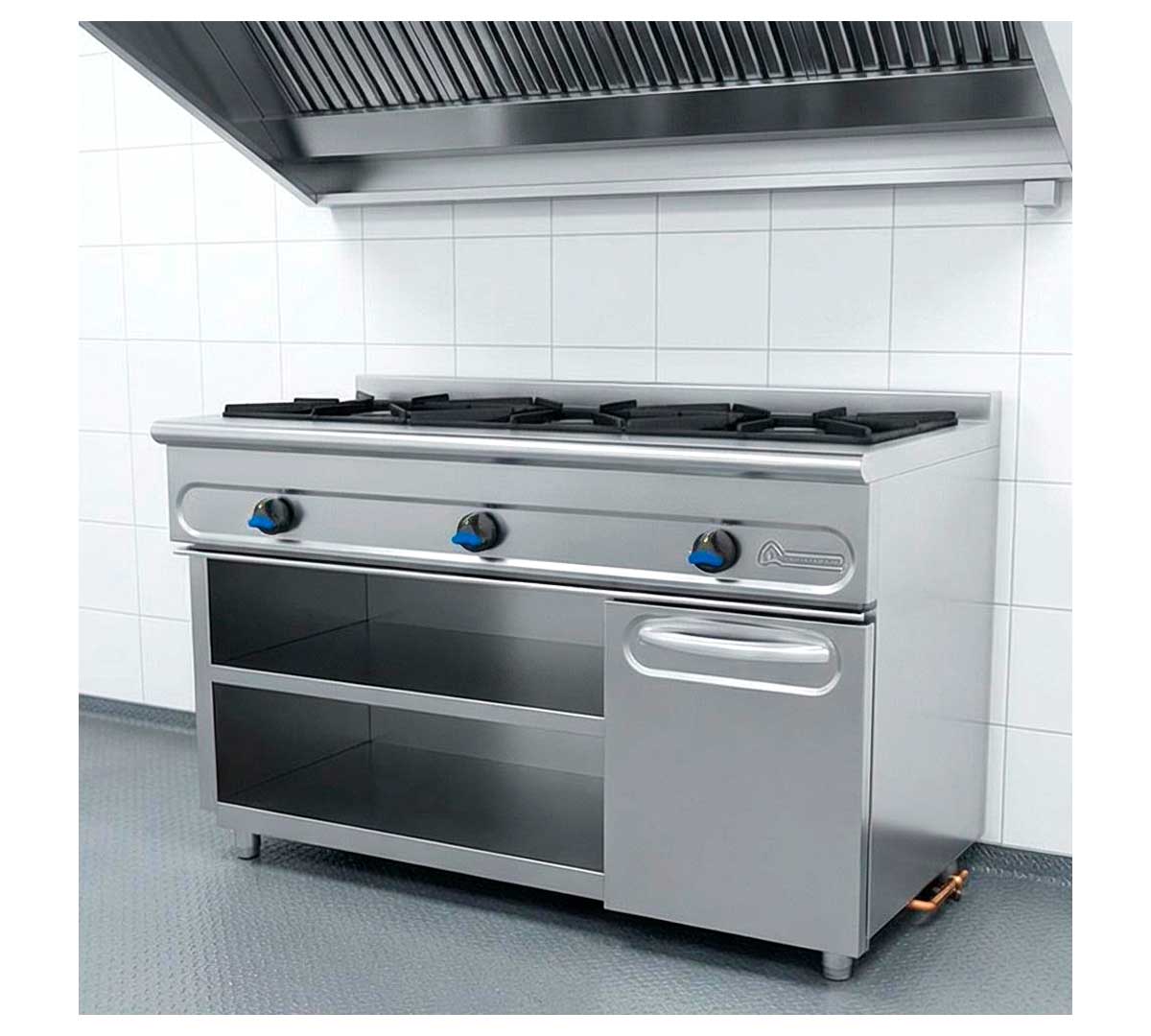 Este equipo, también conocido como cocina de gas profesional o fogón industrial, destaca por su diseño en acero inoxidable y su capacidad para ofrecer una cocción uniforme y segura en todo momento.