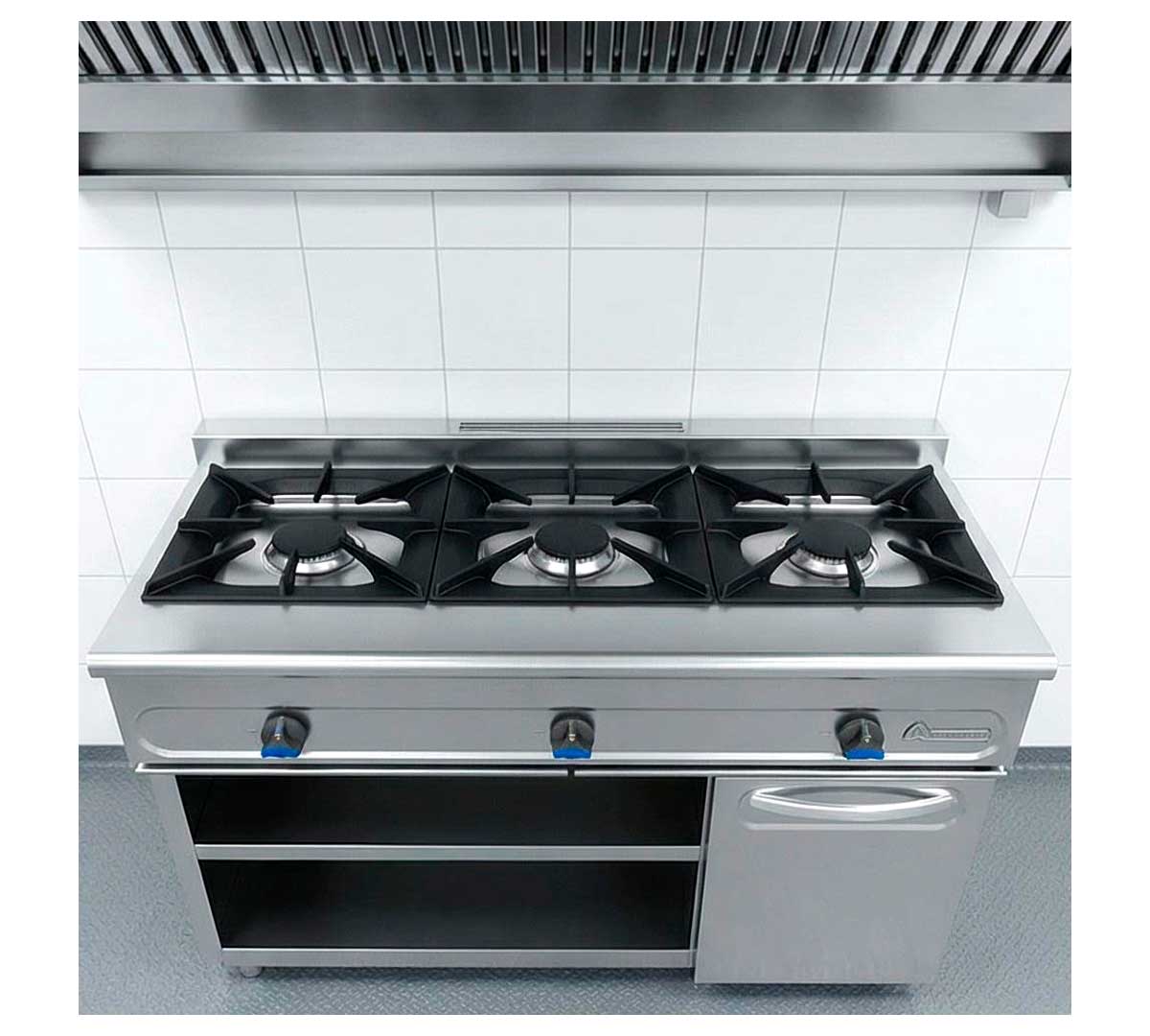 Cocina a gas de 3 fuegos con estructura en acero inoxidable, válvula de seguridad, fuegos abiertos con piloto protegido, parrillas esmaltadas y bandeja recogegrasas. Incluye armario portabombonas. No incluye horno.