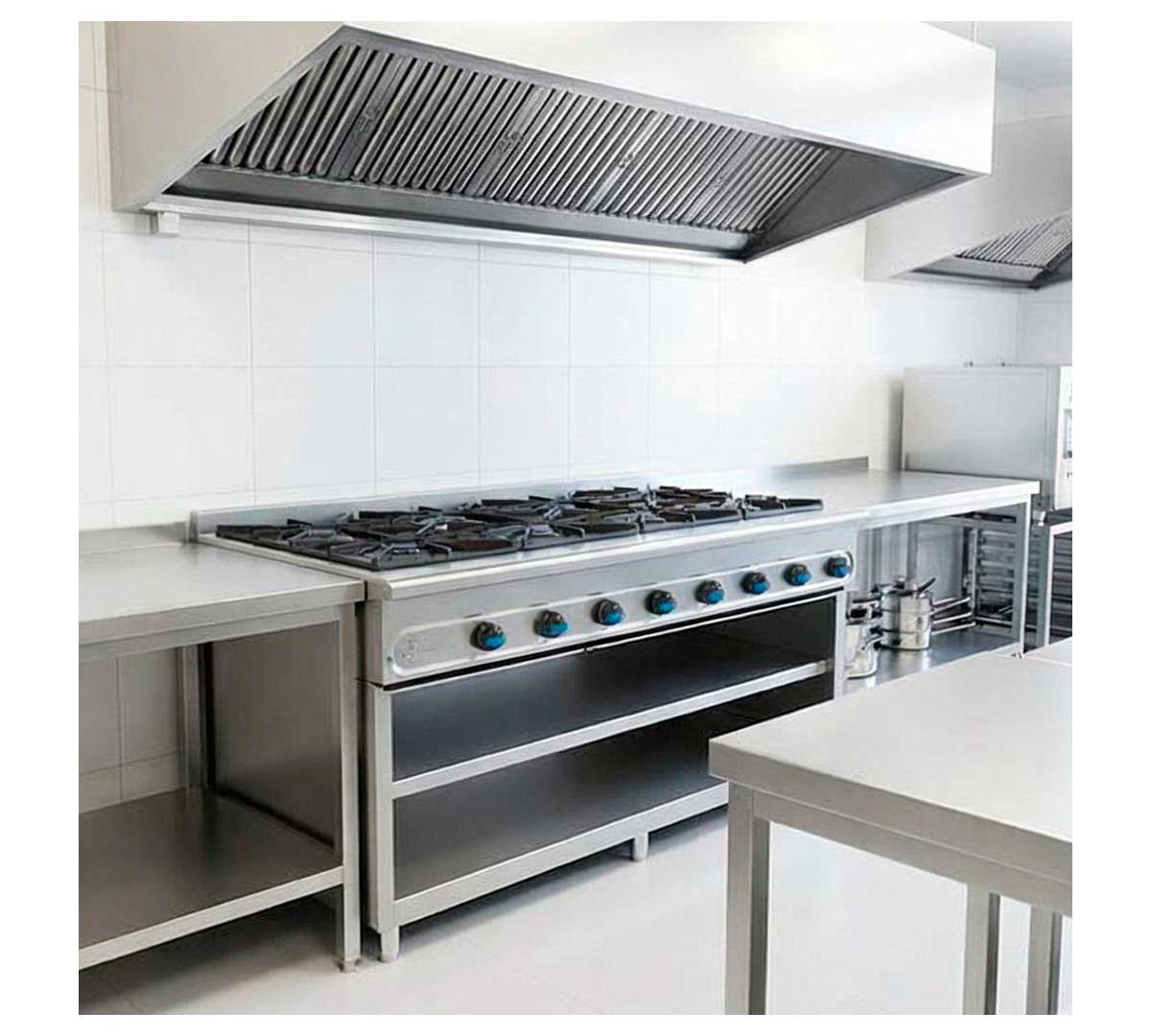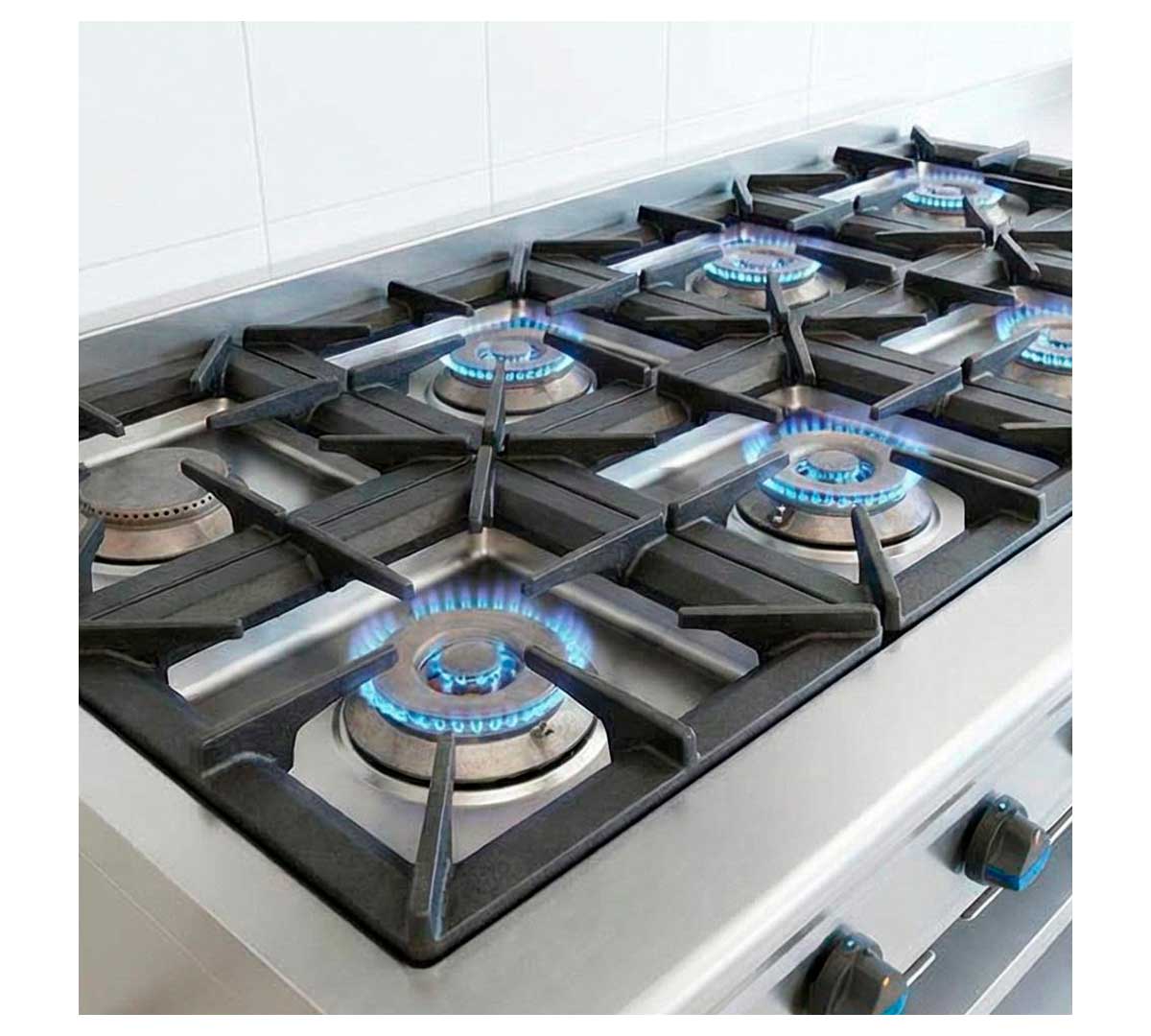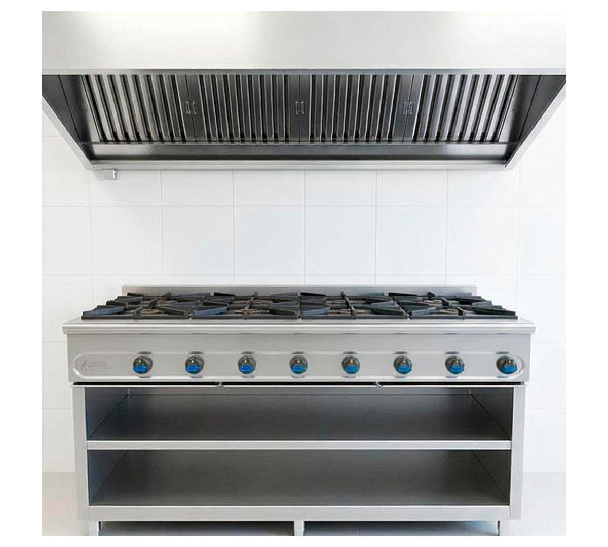 Cocina serie 900 a gas con ocho fogones. Provista de mueble soporte inox con entrepaño. Tiene los fuegos abiertos con tubo piloto protegido mediante protector de acero inoxidable. Incluye bandeja recoge grasas y parrilla reductora.
