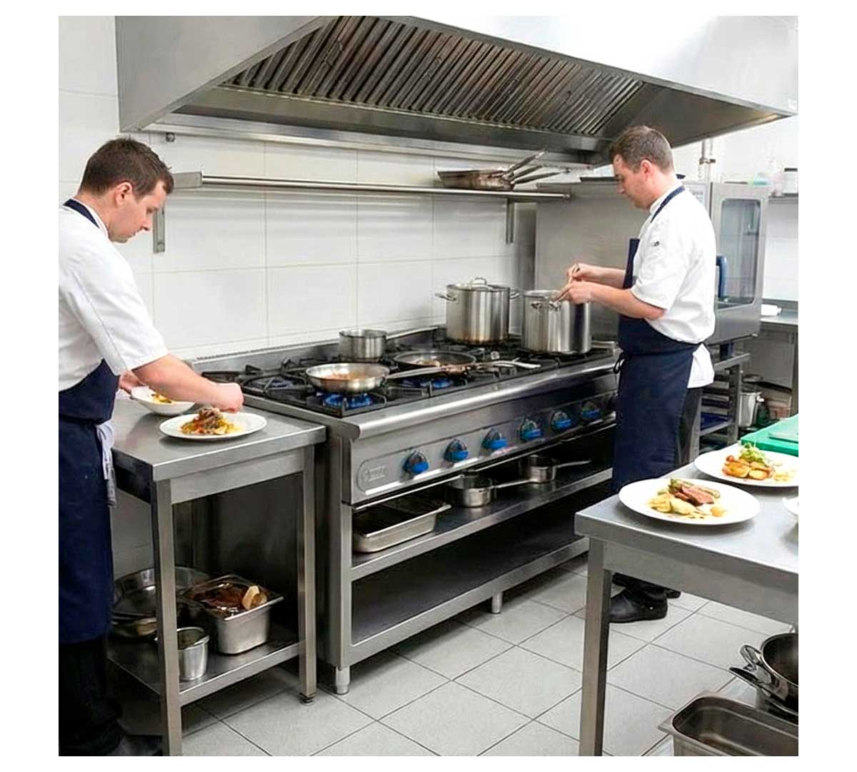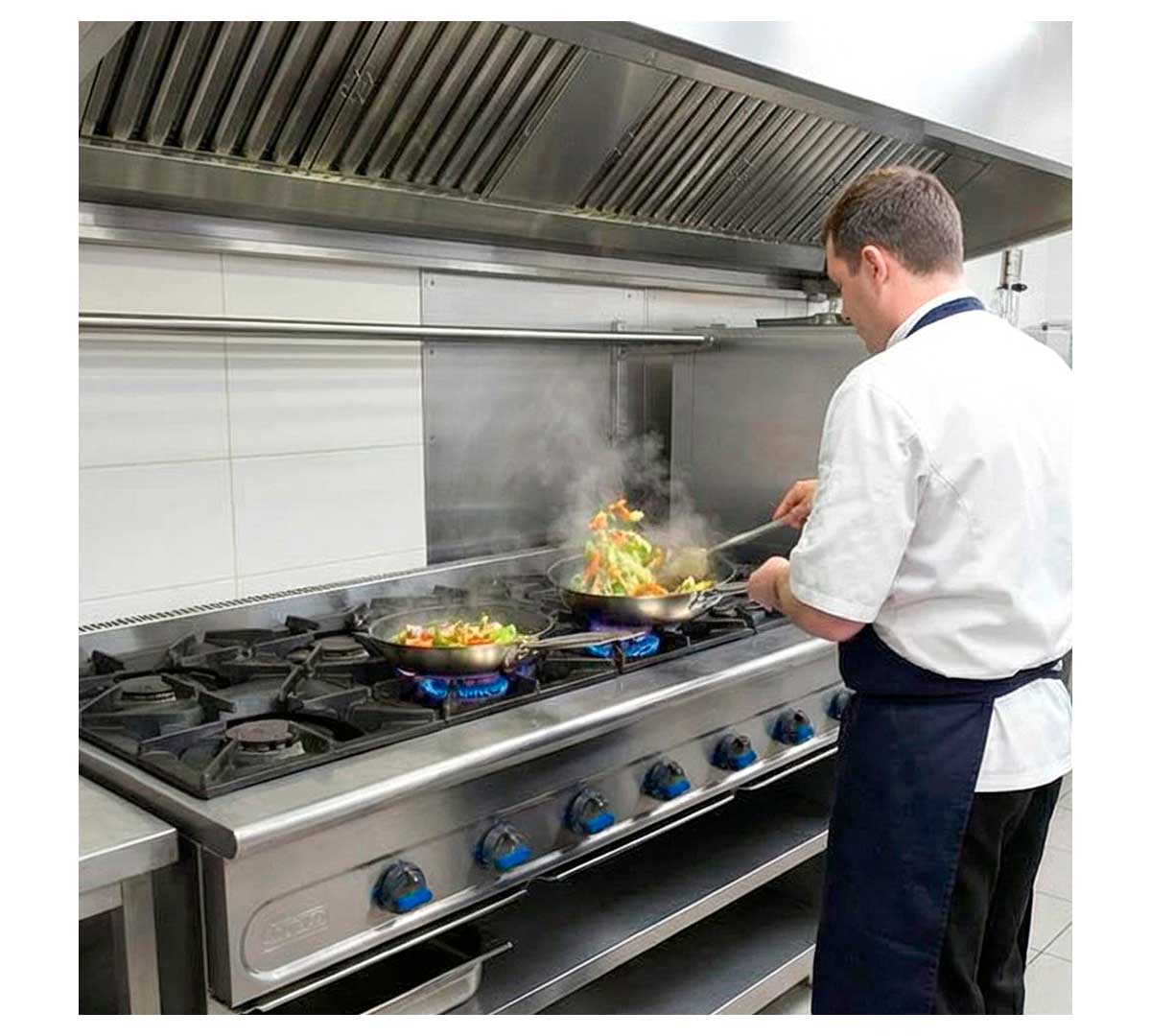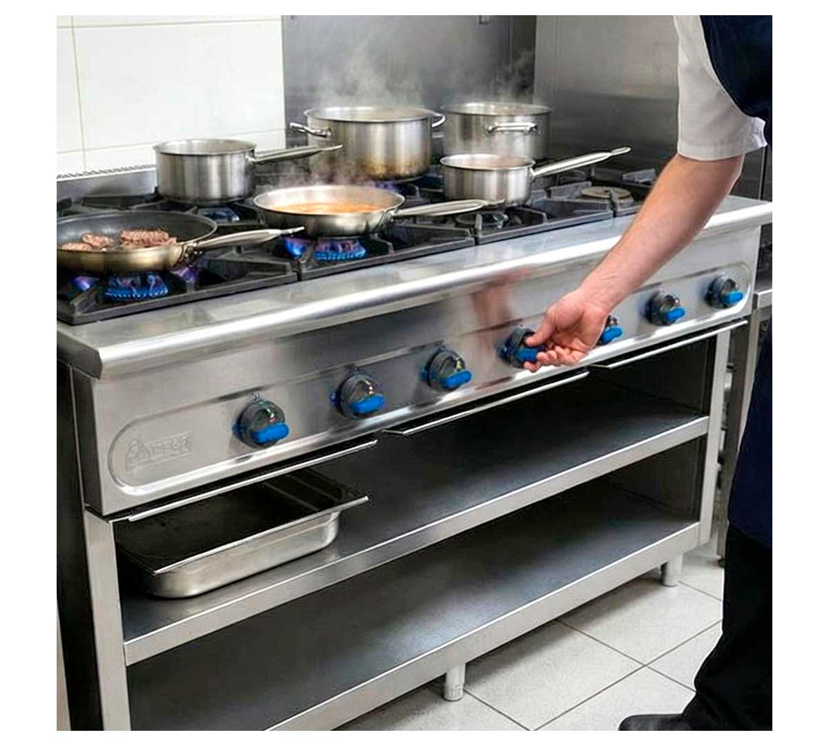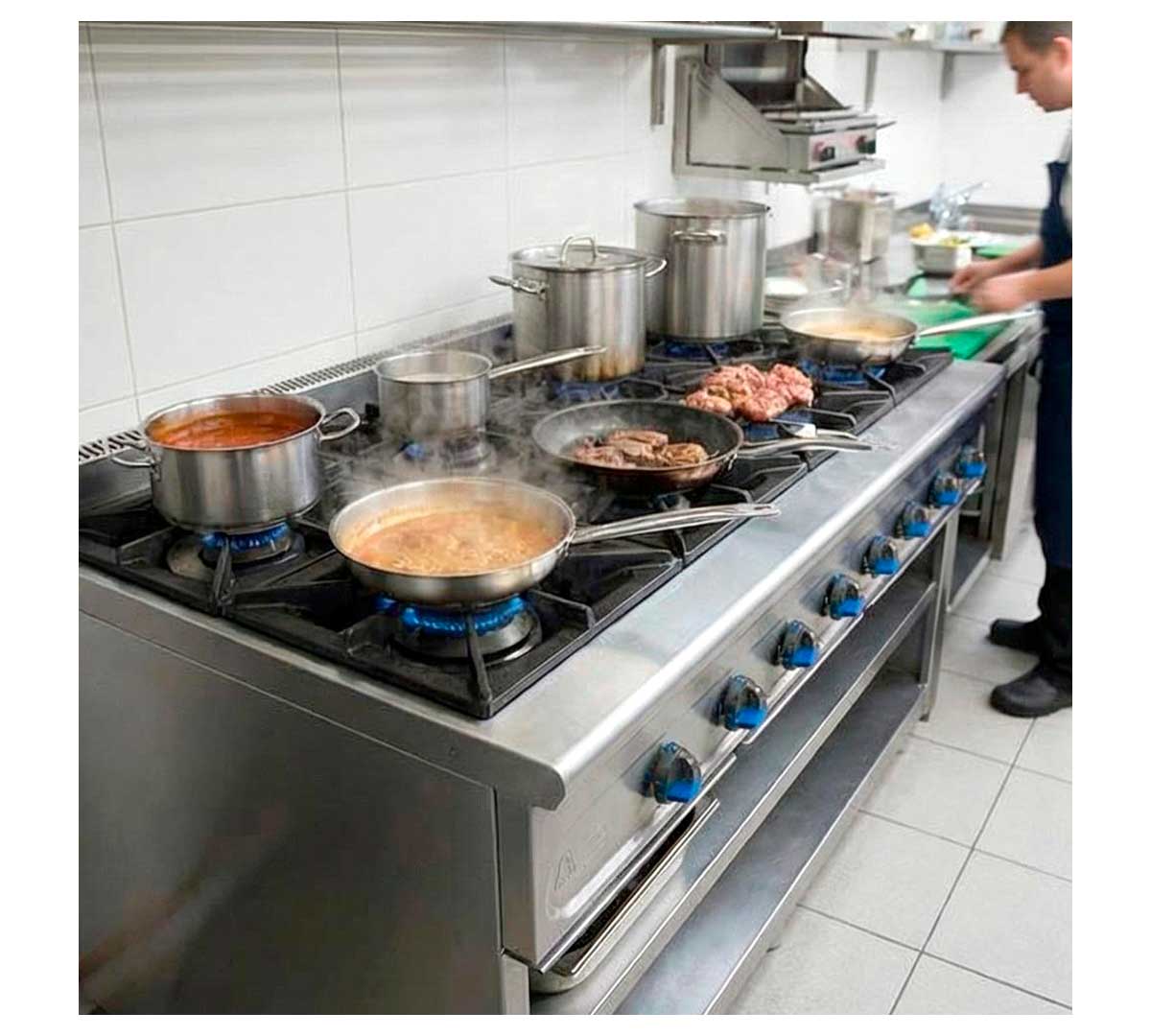 Esta cocina de gas es ideal para cocinas centrales, restaurantes de gran capacidad, comedores colectivos y cualquier espacio donde se requiera una producción continua y simultánea de varios platos. Su diseño permite trabajar con ollas y sartenes de gran tamaño, optimizando los tiempos de cocción y facilitando la gestión de menús variados.