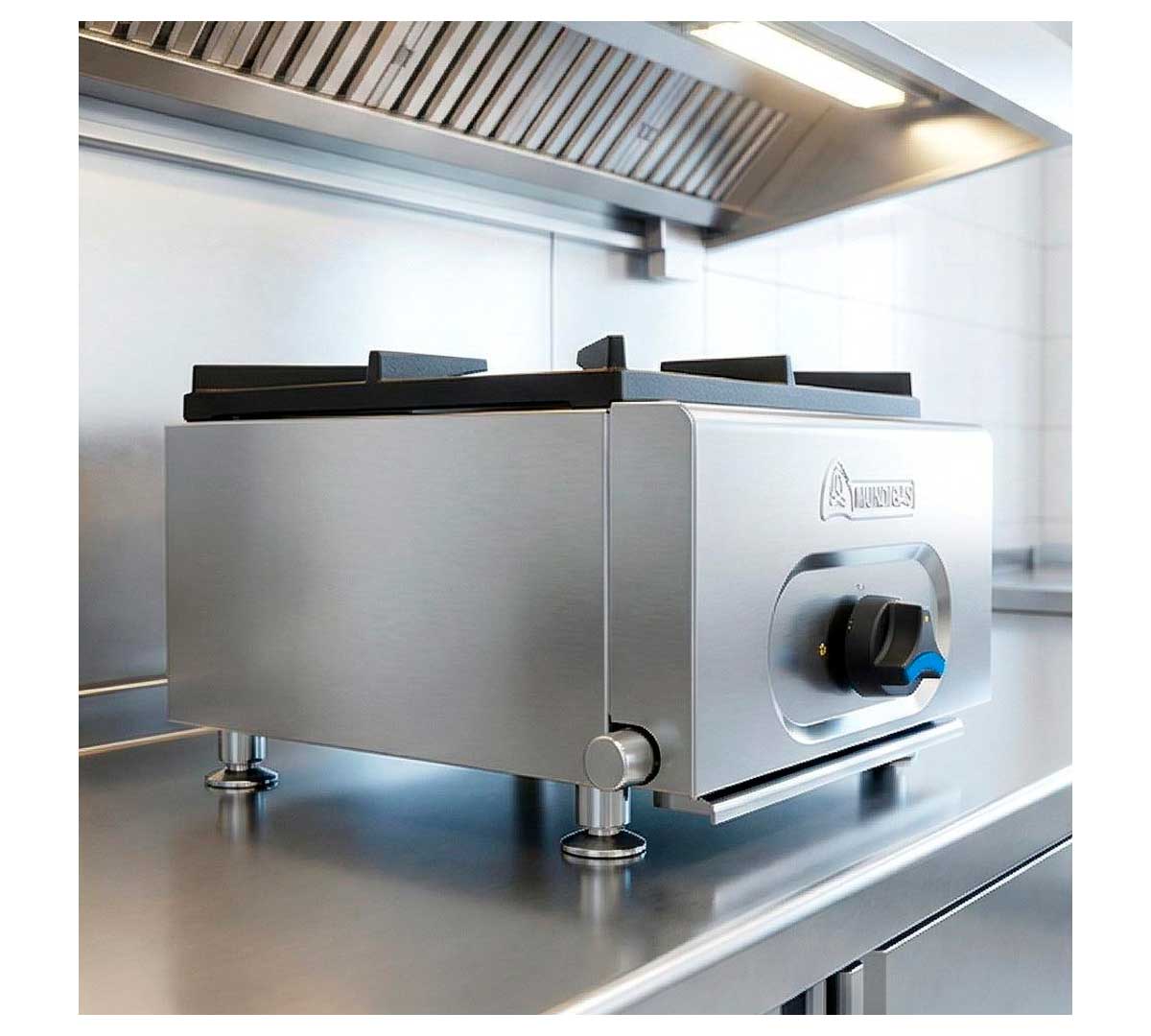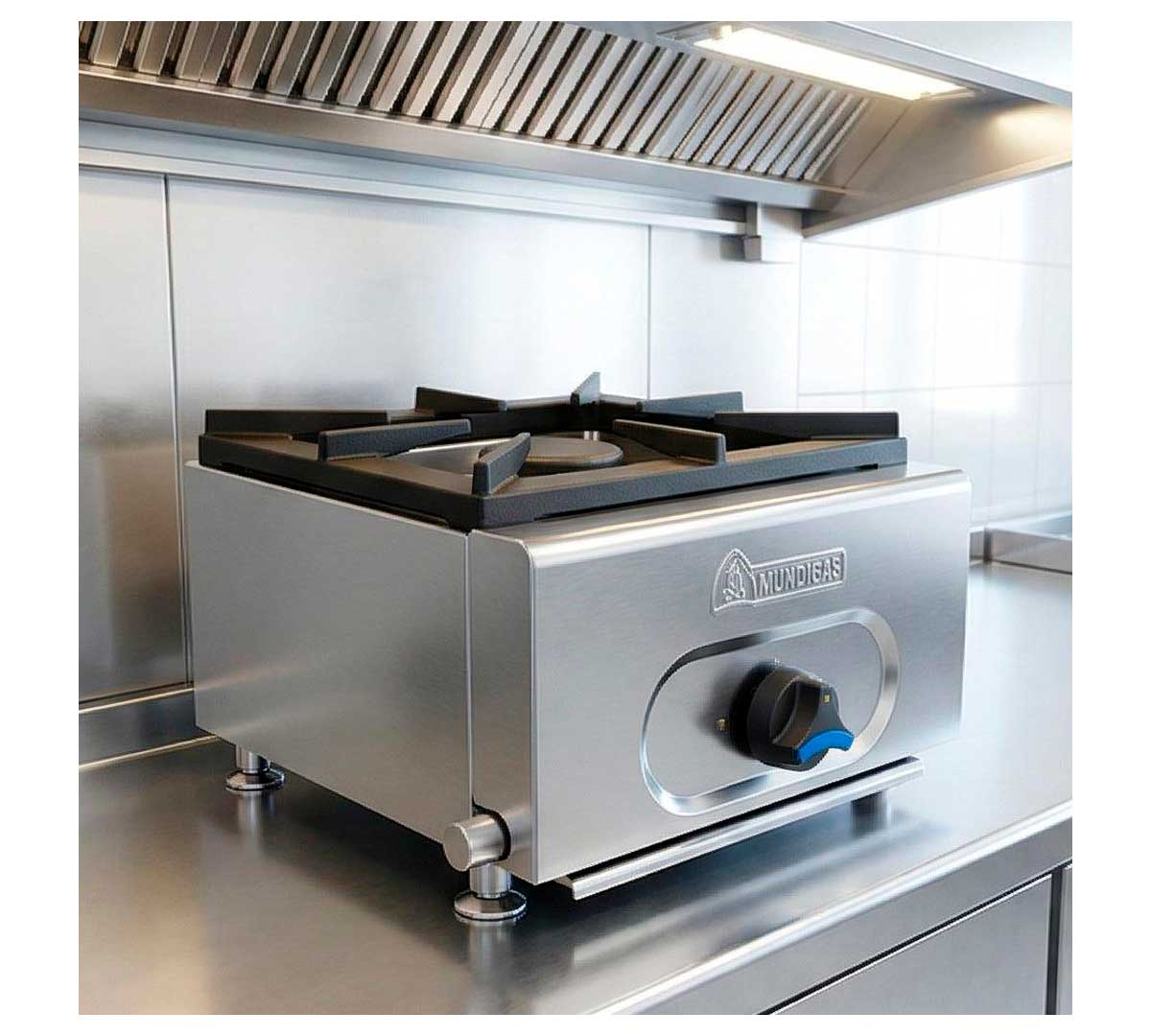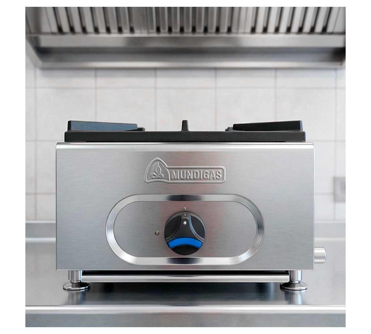 Cocina compacta de sobremesa con 1 fogón. Está fabricada en acero inoxidable con patas regulables en altura. Incluye válvula termopar de seguridad y esparcellamas esmaltado en color negro.