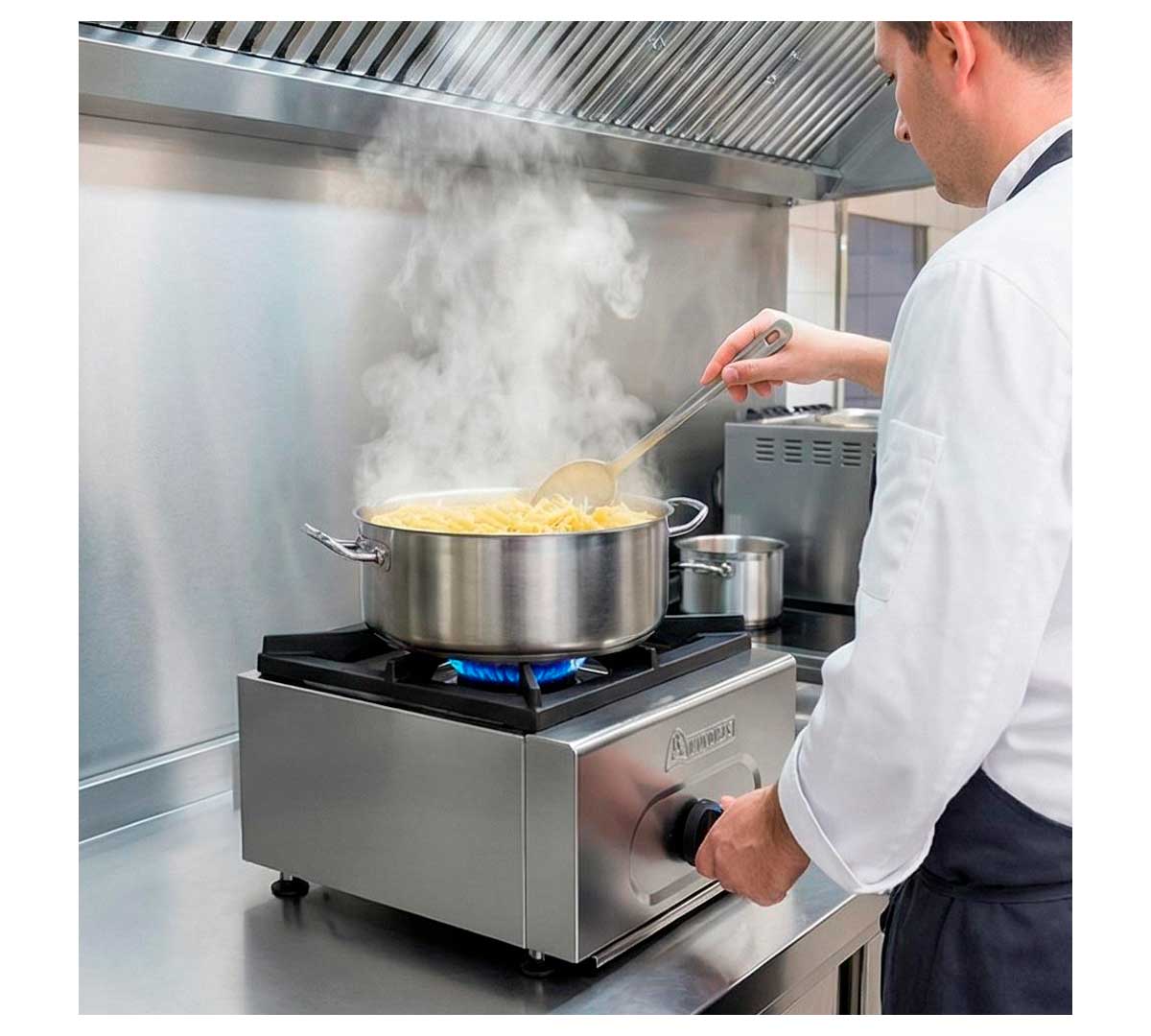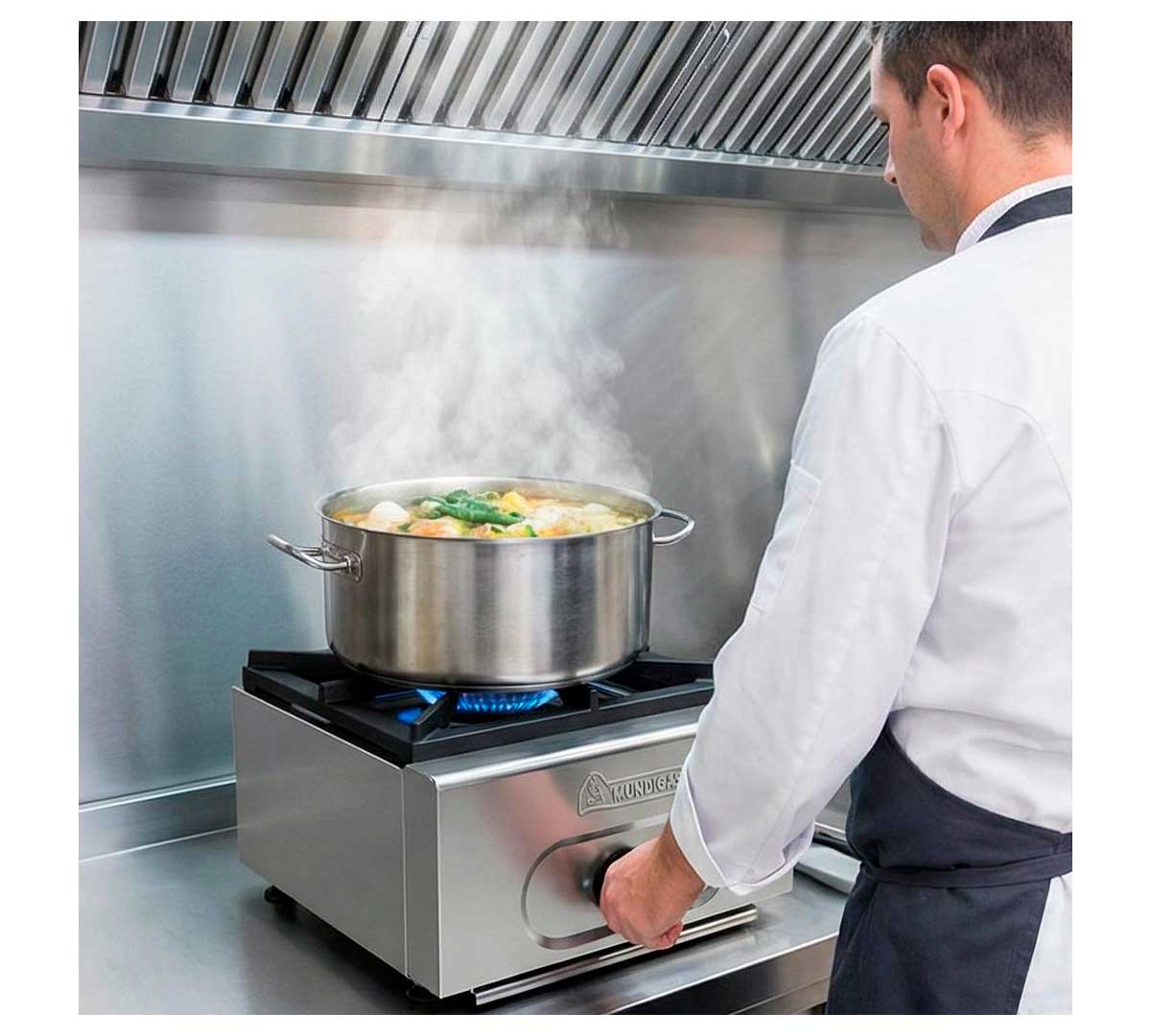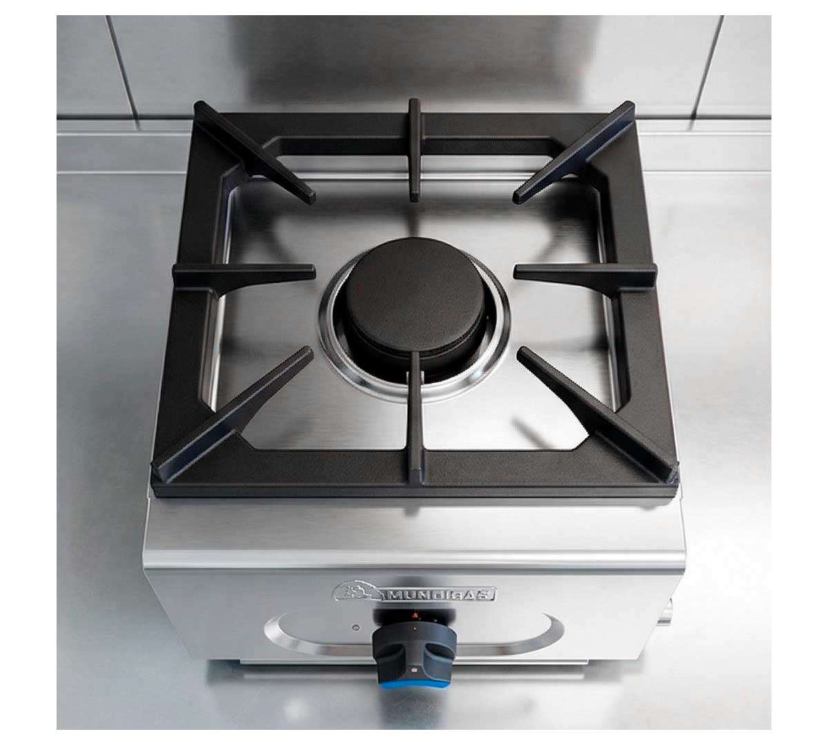Cocina compacta de sobremesa con 1 fogón. Está fabricada en acero inoxidable con patas regulables en altura. Incluye válvula termopar de seguridad y esparcellamas esmaltado en color negro.