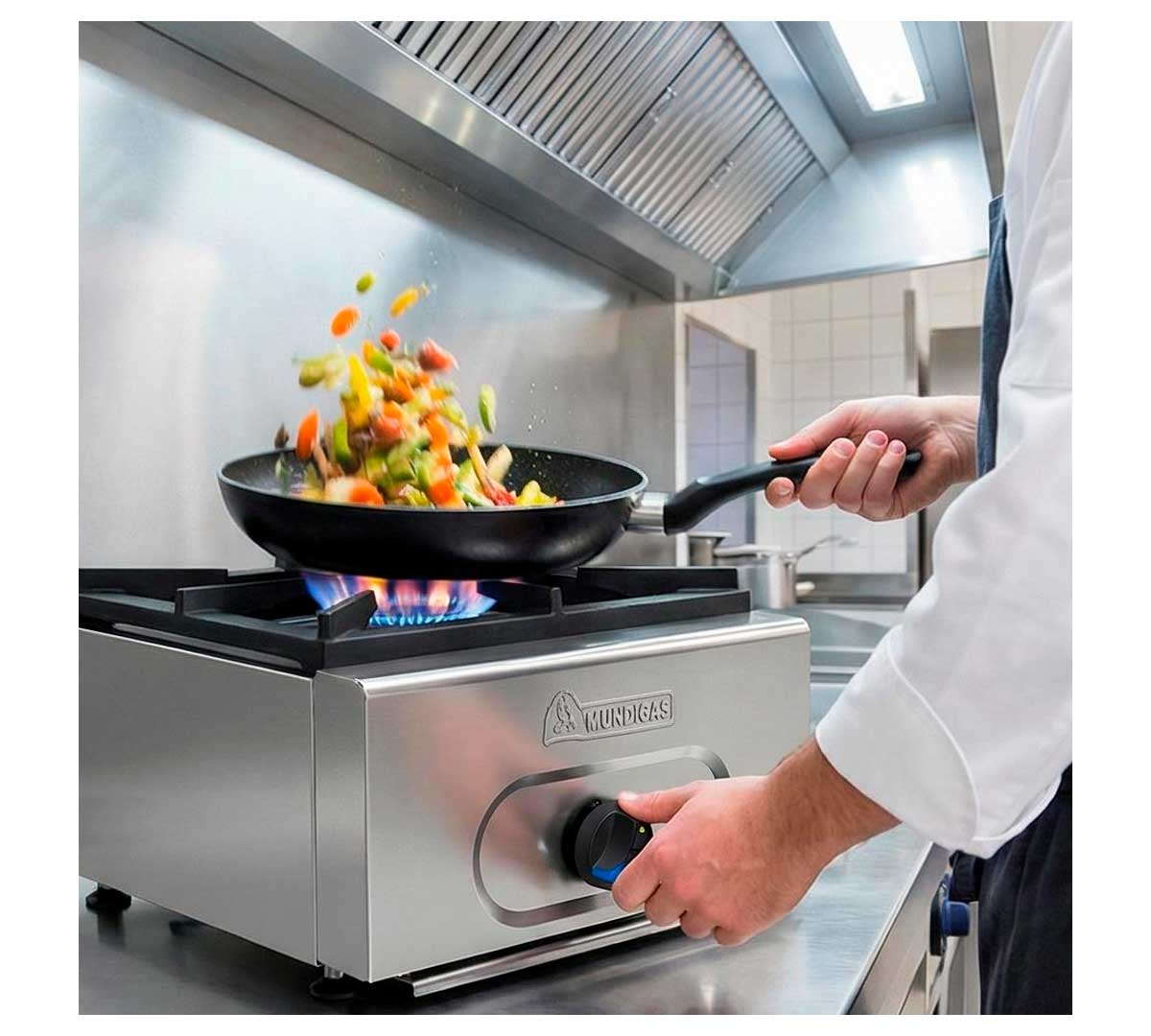Este modelo de cocina PM-330 de un quemador funciona a gas. Tiene un diseño modular de sobremesa con un fondo de 38 cm. Especial para cocinas profesionales muy pequeñas.