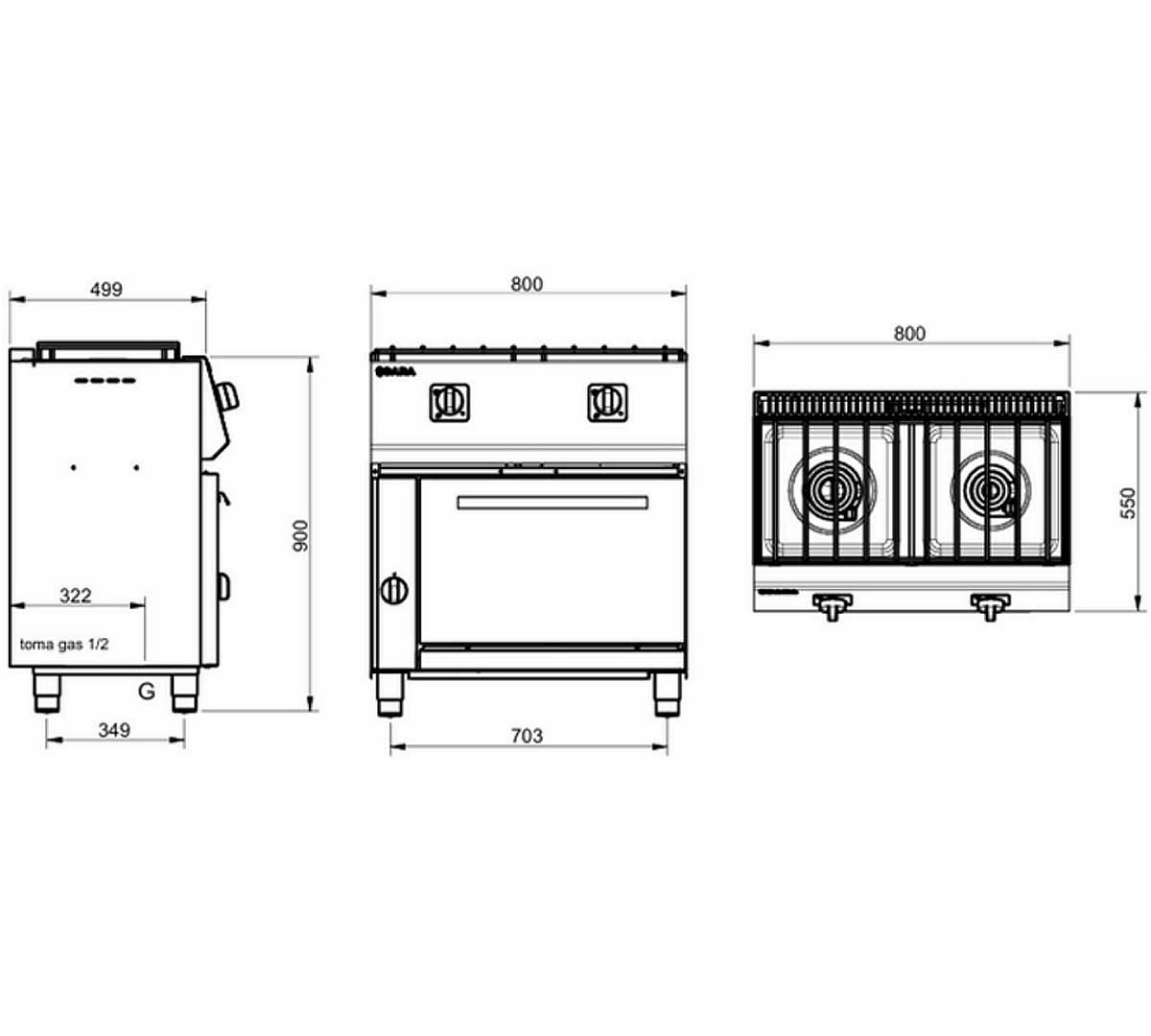 La CGS-521G pertenece a la Serie 550 de SARA, diseñada para instalación sobre suelo. Incorpora 2 quemadores y añade gratinador a horno, en un formato modular compacto. Esta serie es ideal para espacios de cocina pequeños como bares y cafeterías.