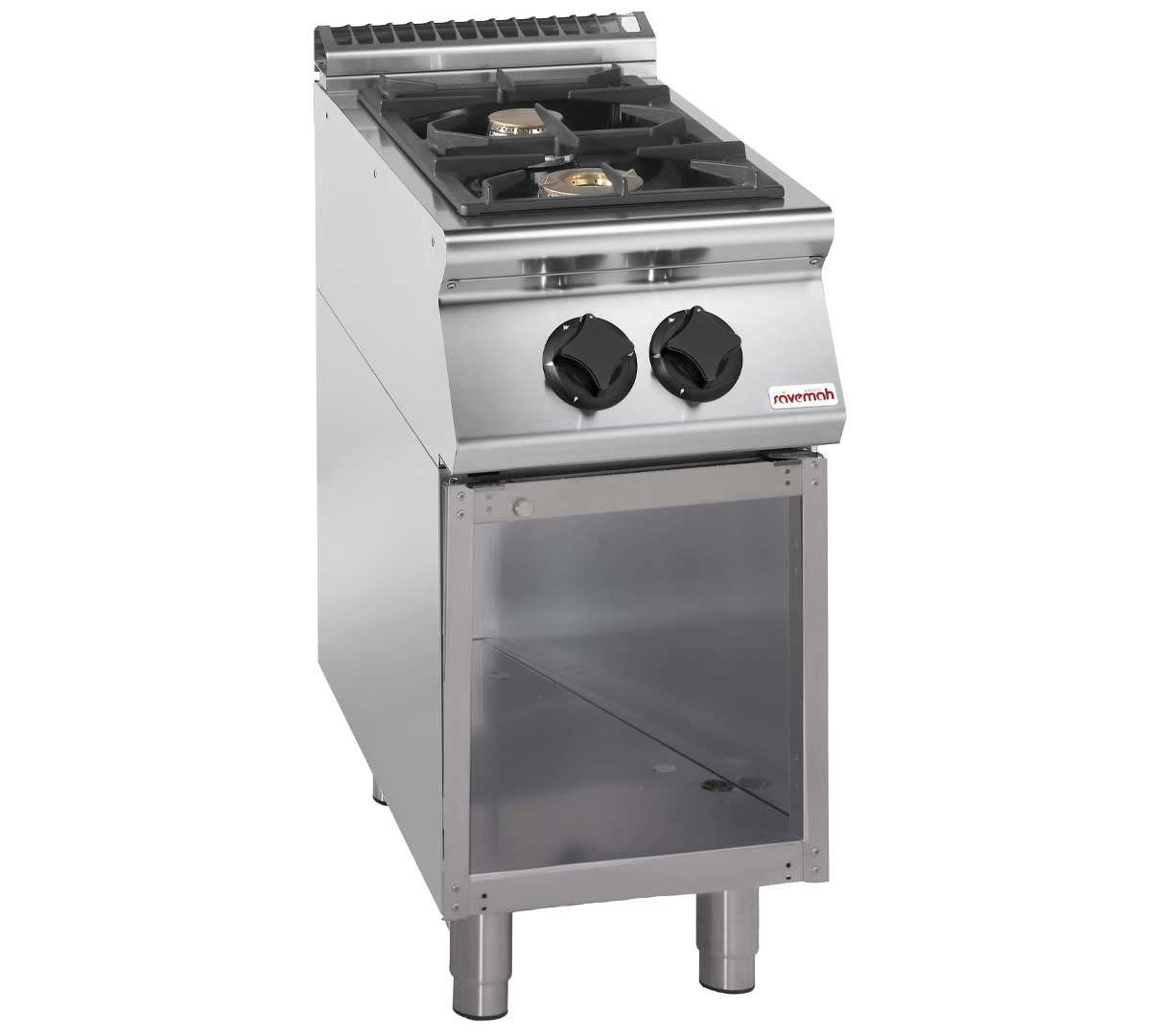 Cocina modular de gas con 2 fuegos. Encimera en acero inoxidable AISI 304 de 2 mm. Quemadores de alto rendimiento y mueble abierto para máxima accesibilidad. Fácil limpieza.