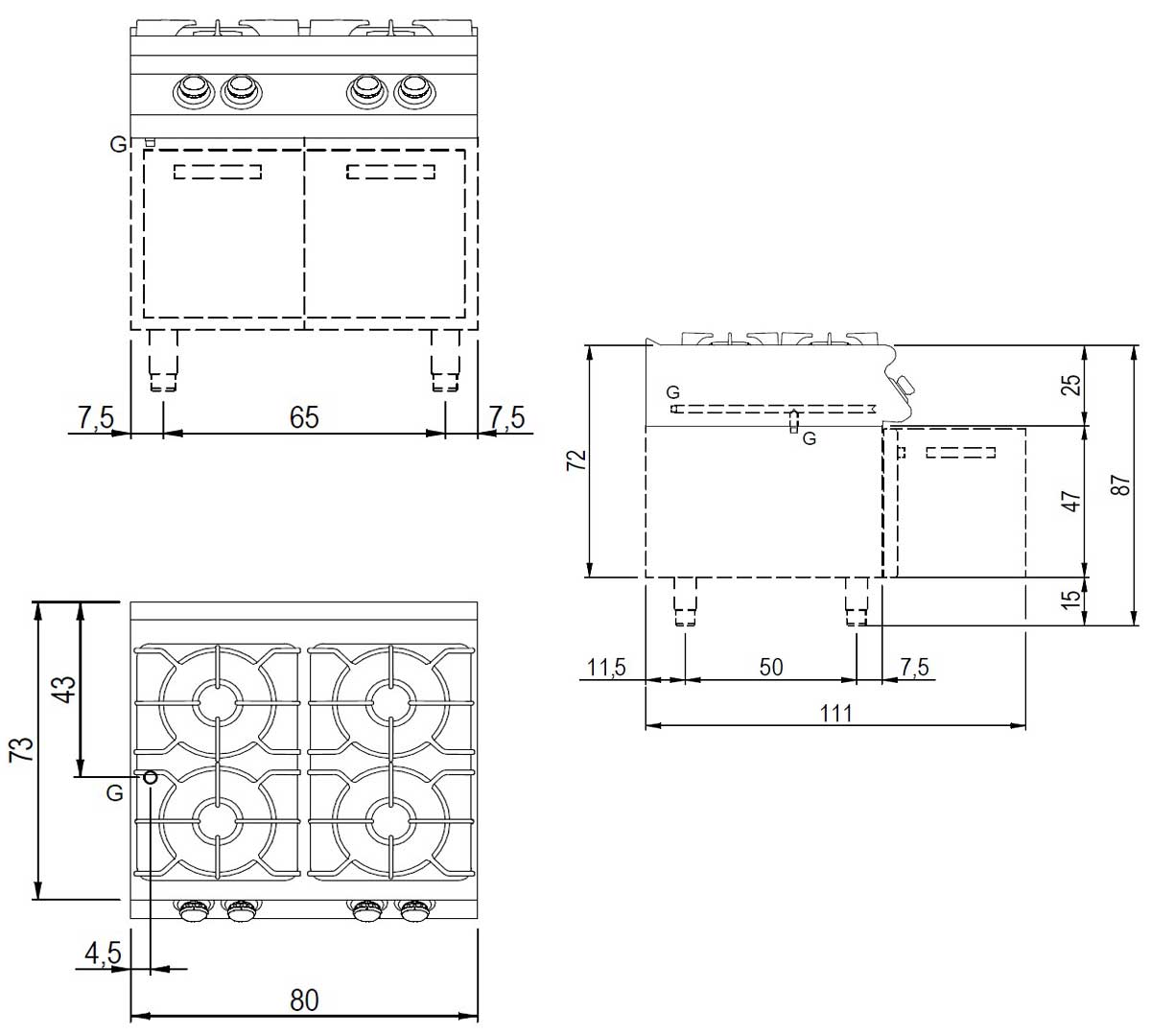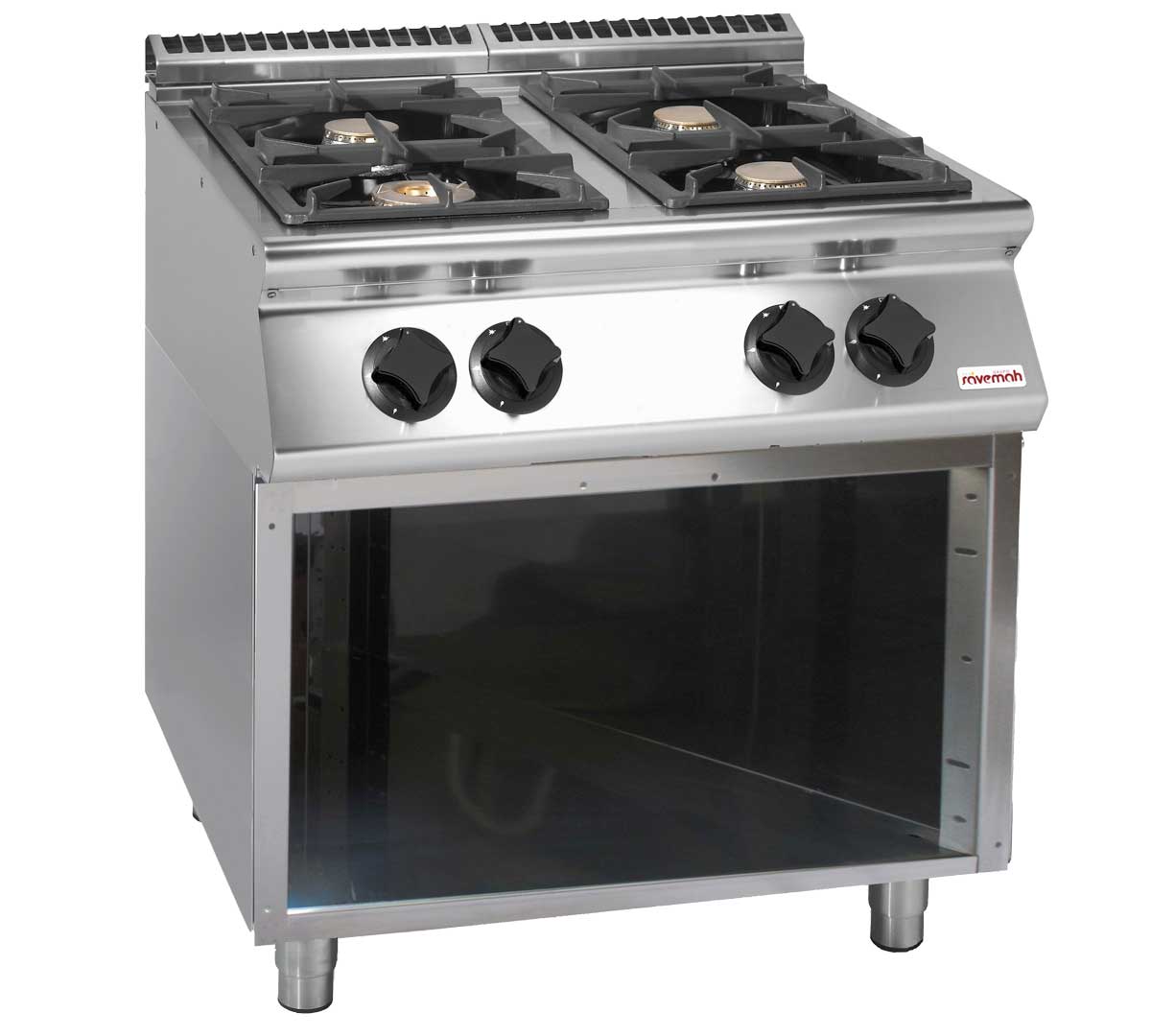 Esta cocina de 4 fuegos está especialmente indicada para cocinas profesionales que requieren una producción intensiva y continua, como restaurantes, hoteles, comedores colectivos y cualquier espacio donde la versatilidad y la potencia sean prioritarias. Su estructura abierta facilita la limpieza y el acceso, lo que la convierte en una opción ideal para ambientes donde la higiene y la organización son fundamentales.