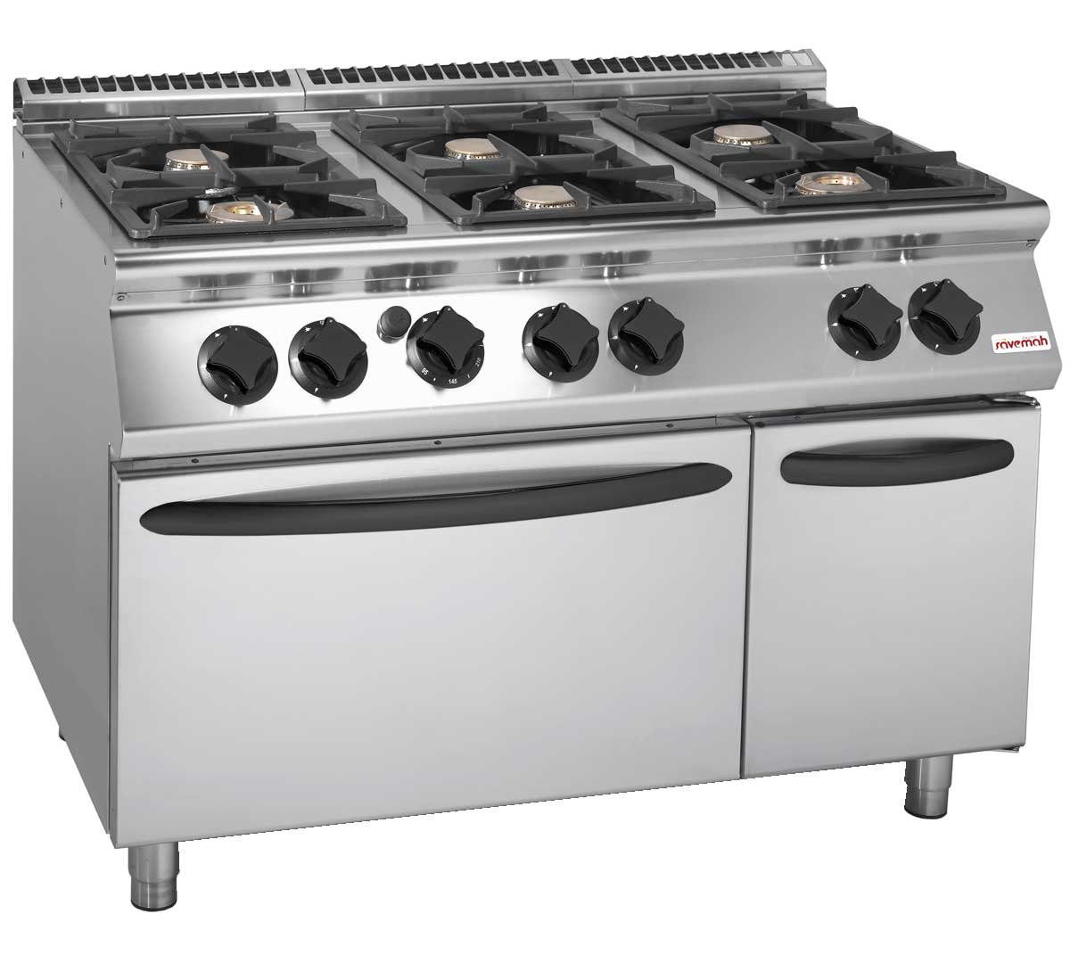 Cocina modular de 6 fuegos con horno. Fabricada en acero inoxidable AISI 304. Con quemadores de alto rendimiento y encendido por llama piloto. Horno GN 2/1 con control termostático.
