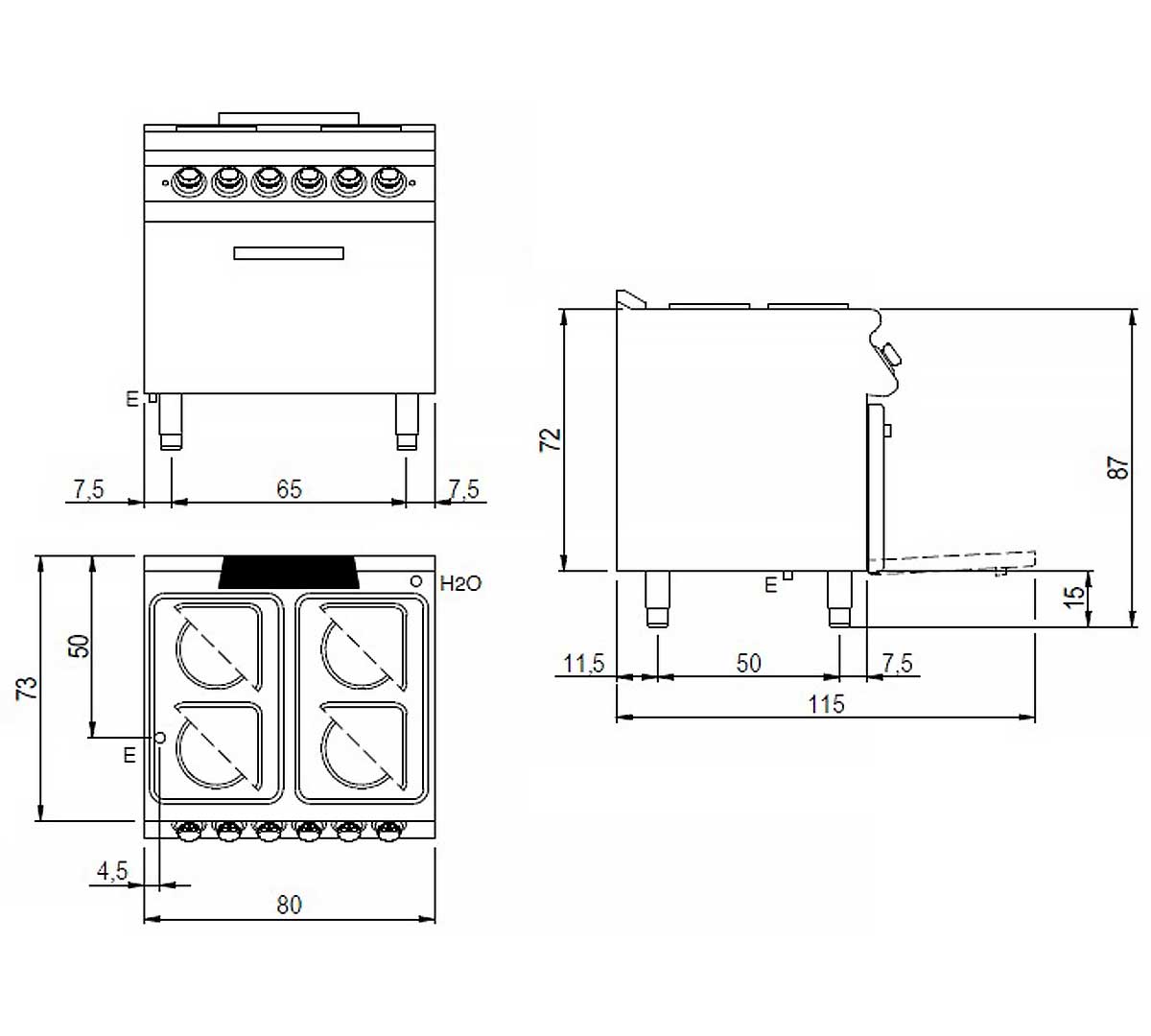 Este equipo, también conocido como cocina eléctrica industrial, destaca por su construcción en acero inoxidable AISI 304 de gran espesor y por la integración de un horno eléctrico estático de gran capacidad, lo que la convierte en una opción versátil y funcional para cualquier espacio de cocina profesional.
