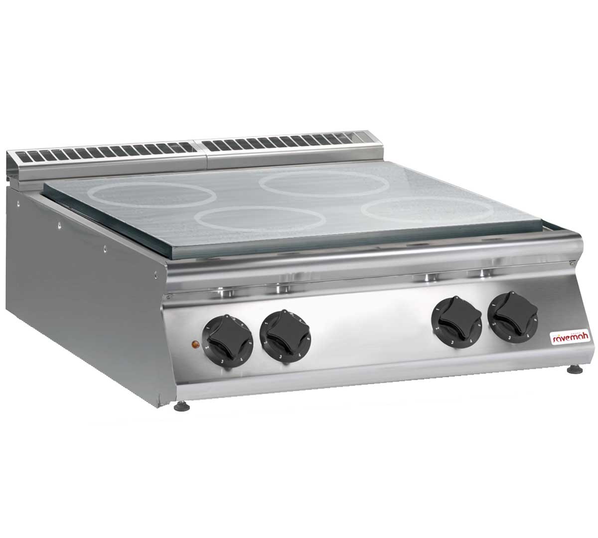 La Cocina SV 98 TPE-T pertenece a la Serie 900 Modular, con encimera de acero inoxidable AISI 304 y 4 placas radiantes circulares de 220 mm. Cada zona cuenta con control independiente de energía, asegurando una cocción precisa y estable incluso en producciones intensivas.