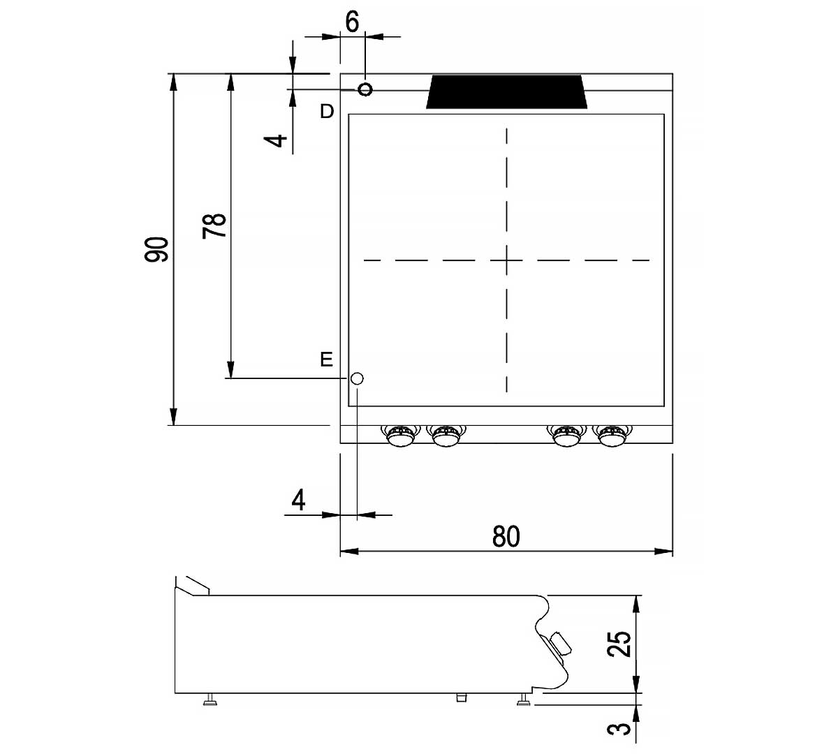 Encimera de acero inoxidable AISI 304, con placa radiante eléctrica de 4 zonas independientes. Tiene control termostático de 50 a 400 °C. Fácil de limpiar y con una estructura robusta, adecuada para uso intensivo en cocinas profesionales.