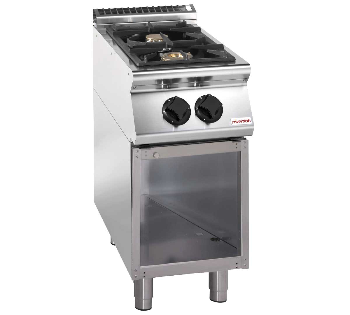 Cocina a gas de 2 fuegos con mueble abierto en acero inoxidable. Llama piloto y seguridad por termopar. Dimensiones 40 x 90 x 87 cm.