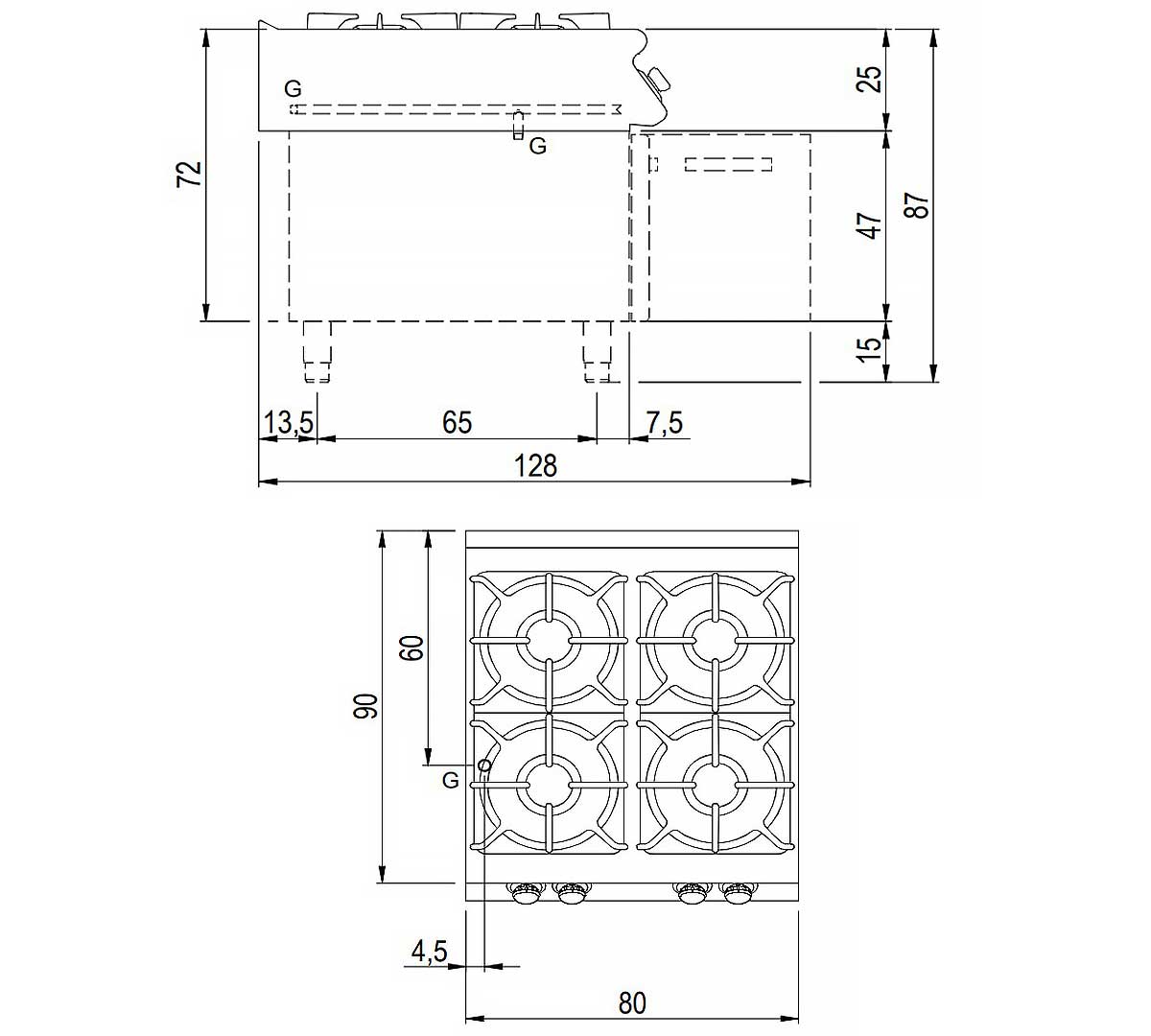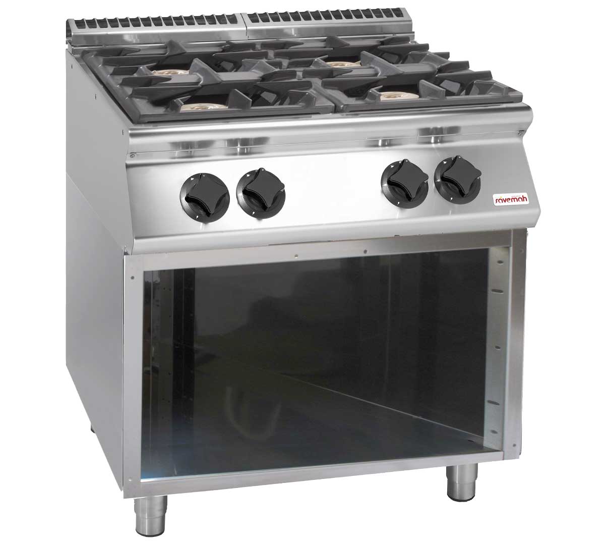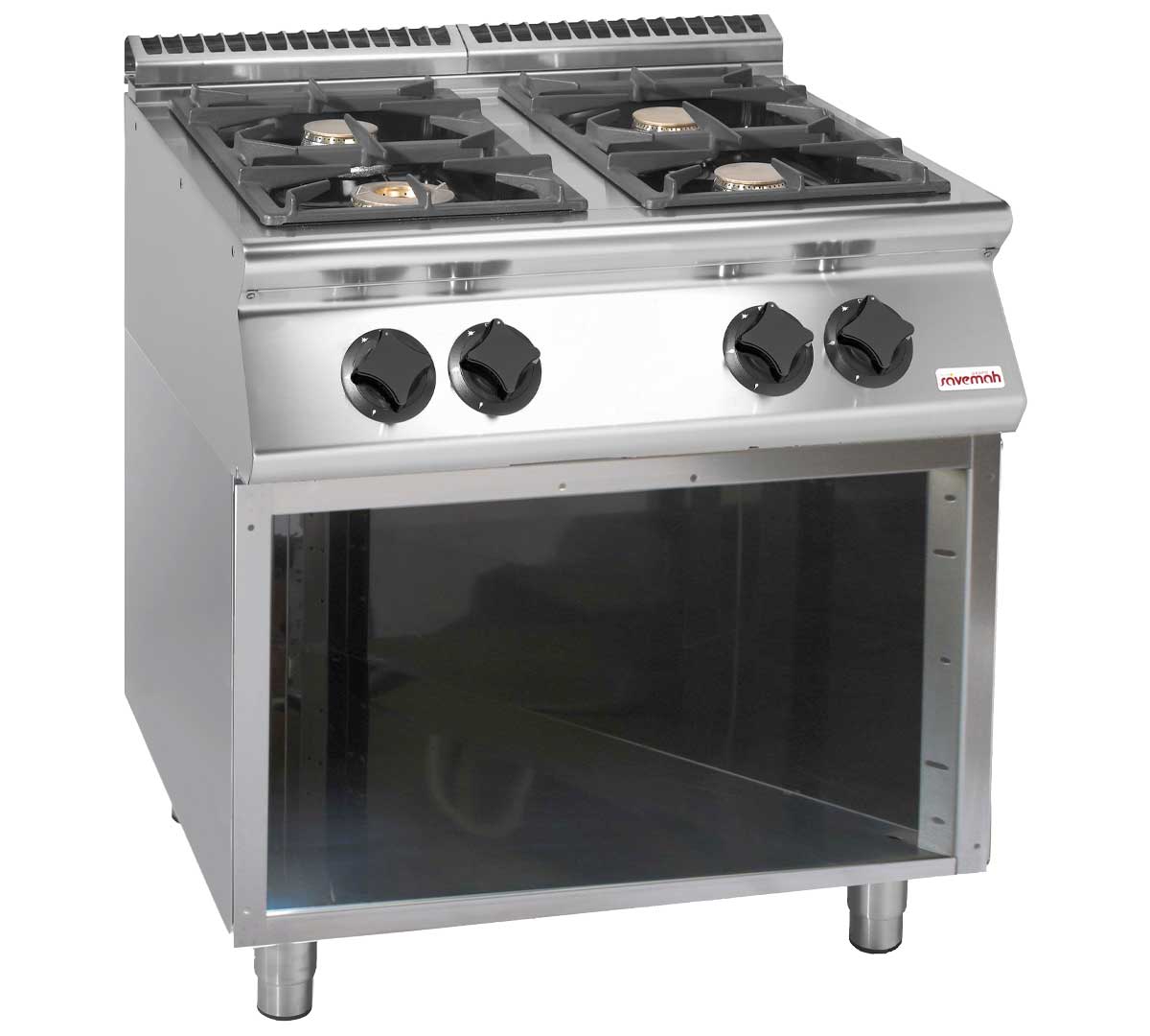 Encimera AISI 304 de 2 mm y 4 fuegos de doble corona 5,5 y 7,5 kW. Con encendido por piloto y seguridad por termopar. Mueble abierto 80x90x87 cm. Preparada para gas natural con inyectores GLP opcionales.