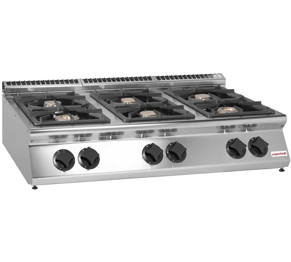 Cocina industrial de 6 fuegos a gas con quemadores de hierro fundido de 5,5 y 7,5 kW. Encimera de acero inoxidable AISI 304 de 2 mm, parrillas de hierro y sistema de seguridad por termopar.