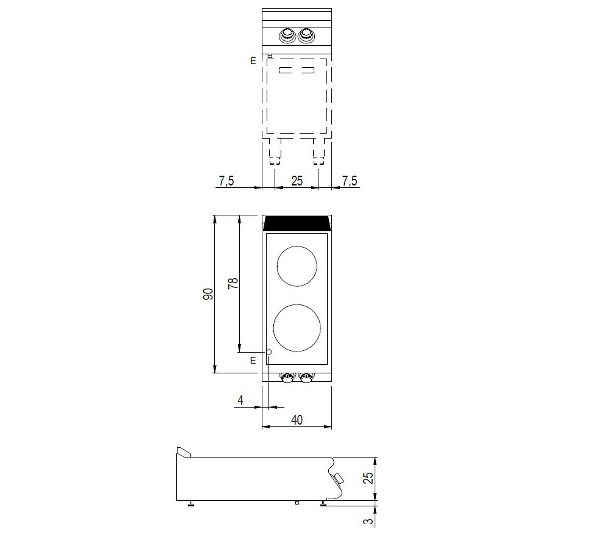 La Cocina SV 94 PVE-T pertenece a la Serie 900 Modular, con encimera de acero inoxidable AISI 304 y plano vitrocerámico sellado herméticamente que ofrece dos zonas de cocción de 3,4 kW cada una con control de energía independiente.