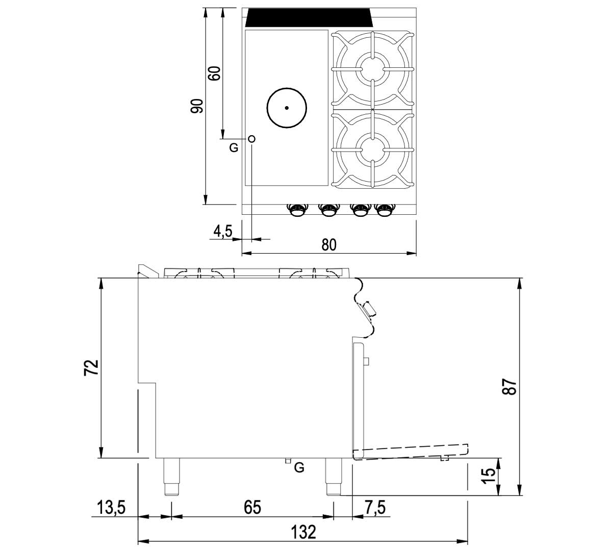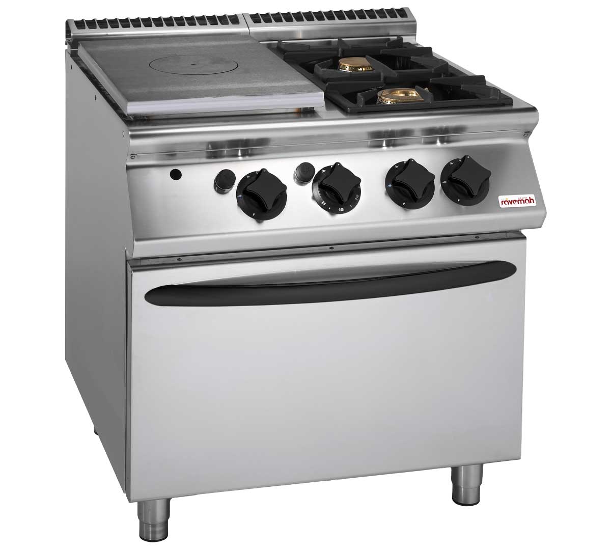 Cocina modular de gran robustez con placa radiante y fuegos a gas. Fabricada en acero inoxidable. Equipada con horno de gran capacidad. Permite la regulación precisa de la temperatura.