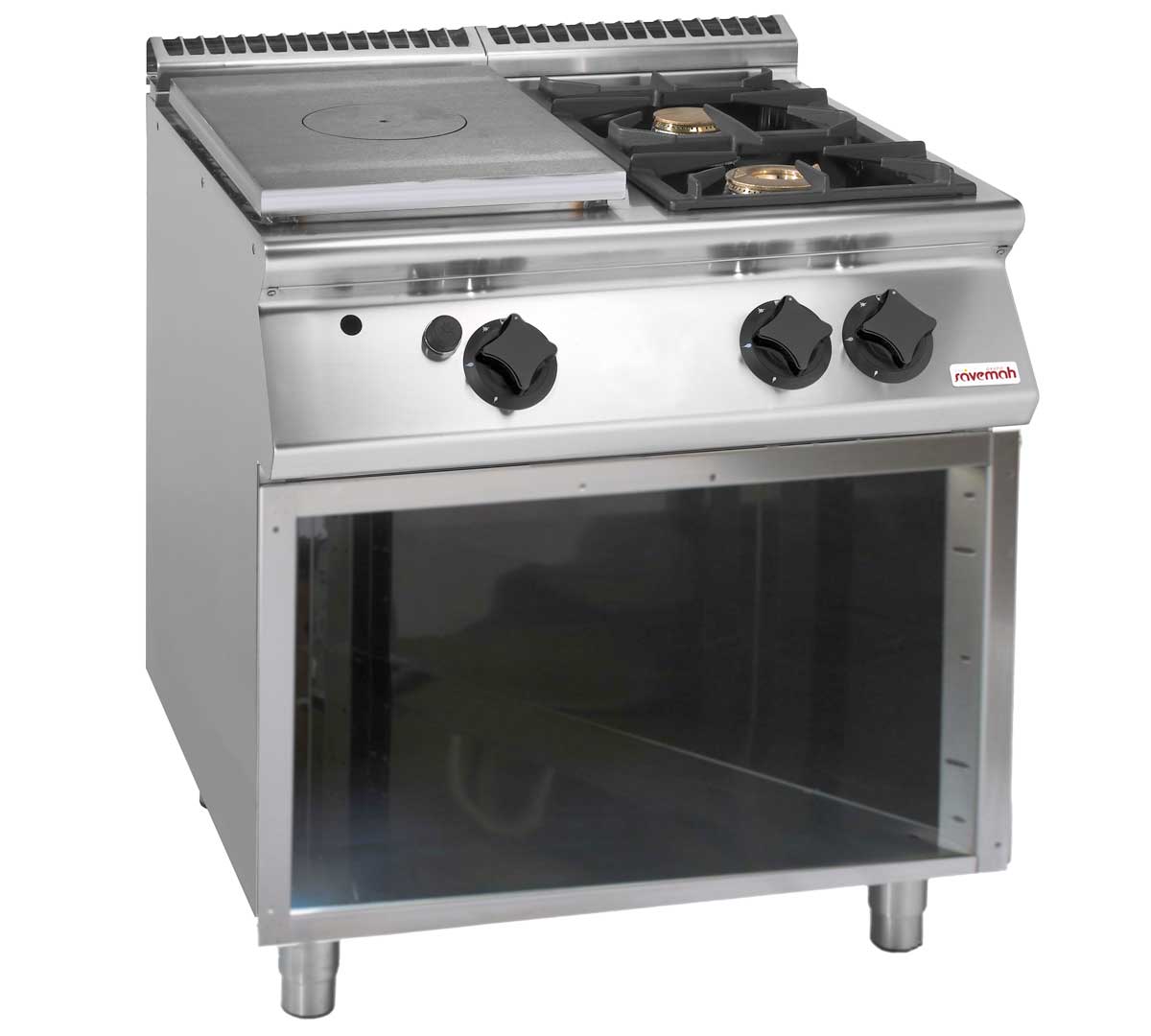 Este modelo es idóneo para cocinas que requieren una alta producción y versatilidad, permitiendo trabajar con grandes ollas y sartenes sobre la placa radiante, mientras que los fuegos adicionales ofrecen la posibilidad de preparar salsas, guarniciones o cualquier otra elaboración simultáneamente. Es especialmente útil en restaurantes, hoteles y colectividades que buscan eficiencia y robustez en su equipo de cocción.