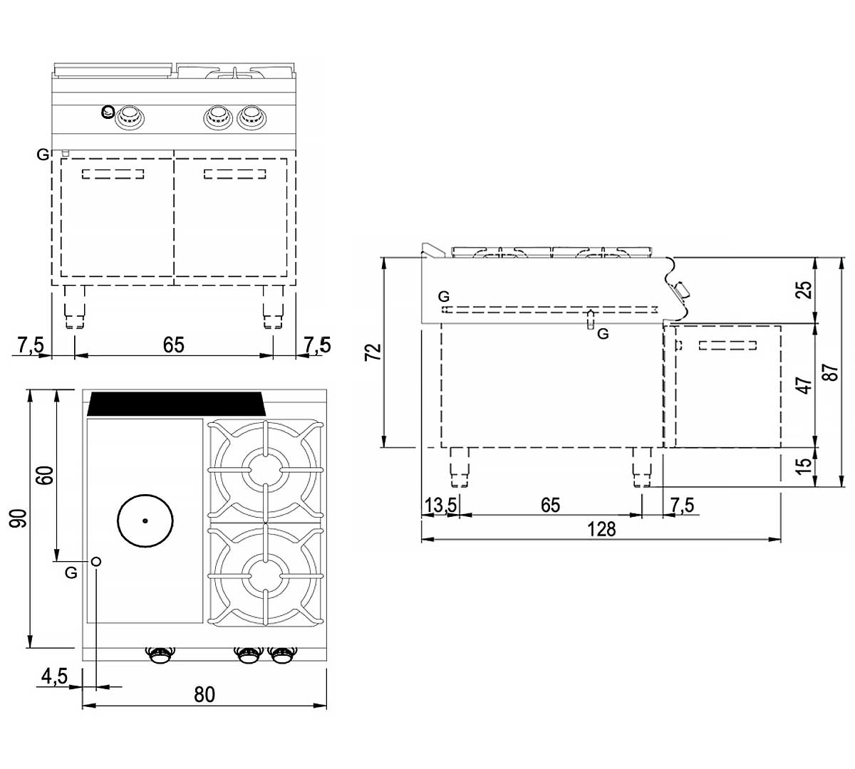 Encimera de acero inoxidable AISI 304. Placa radiante de hierro de gran espesor. Quemadores de alto rendimiento y sistema de seguridad por termopar con encendido piezoeléctrico.