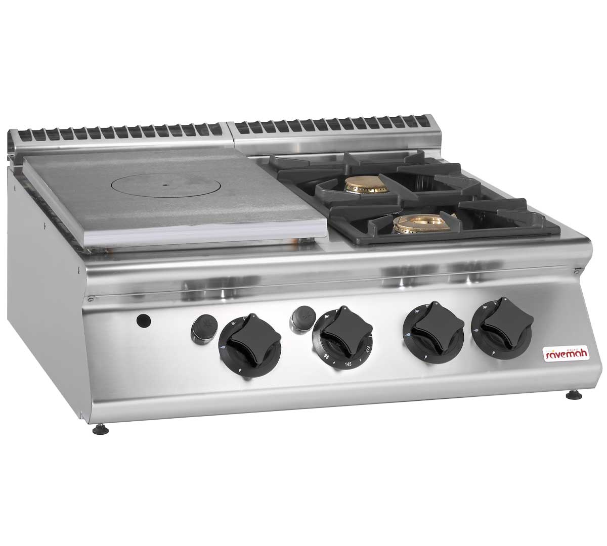 La cocina Savemah SV 98 TPPCGB-T ofrece la combinación ideal entre cocción directa y calor difuso. Su placa radiante de hierro fundido y sus dos potentes fuegos proporcionan rapidez, uniformidad y resistencia, garantizando fiabilidad incluso en servicios de alta exigencia.