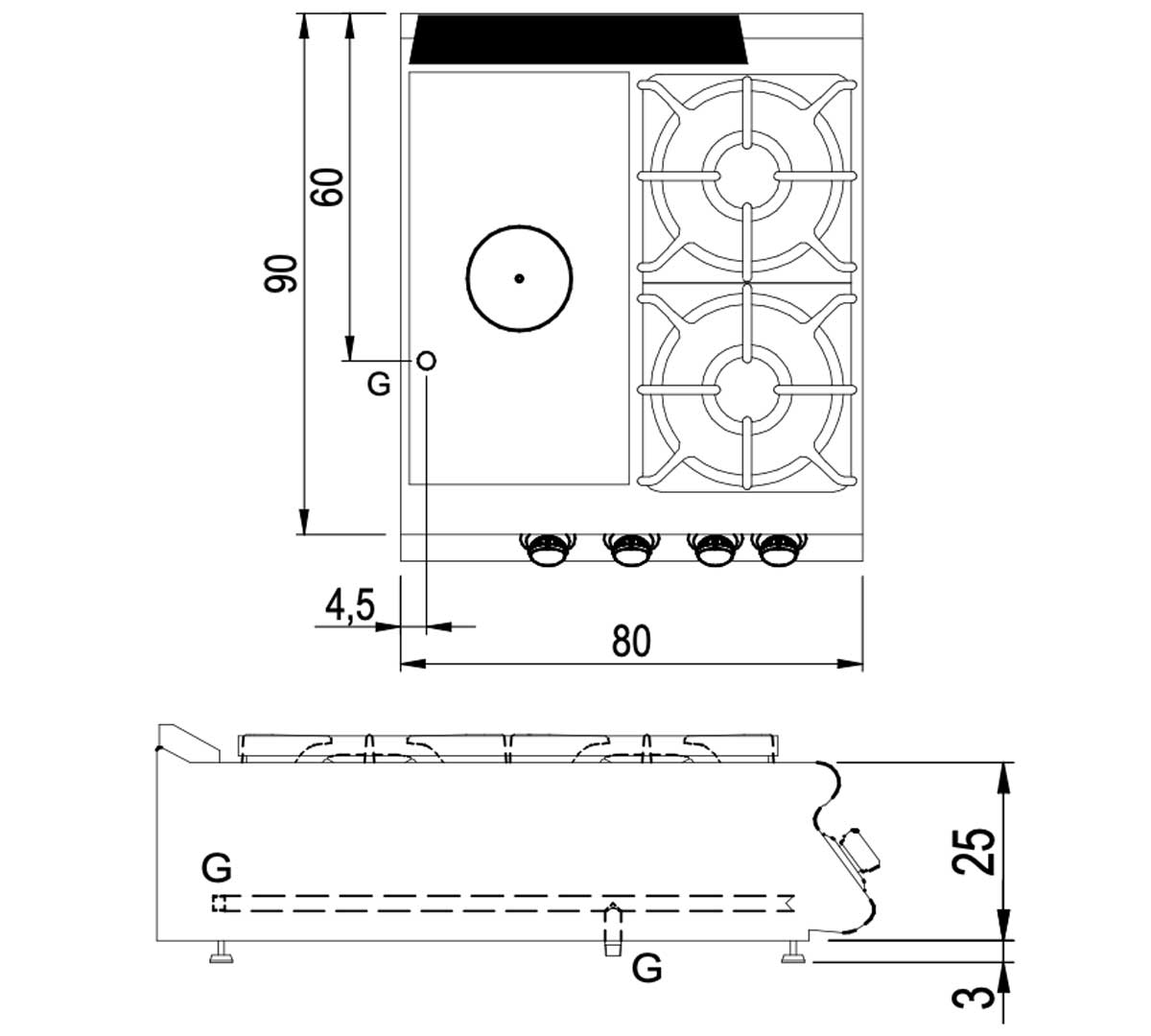 La Cocina SV 98 TPPCGB-T pertenece a la Serie 900 Modular, con encimera de acero inoxidable AISI 304 de 2 mm y una placa radiante central alimentada por un quemador multianillo de 12 kW, combinada con 2 fuegos a gas de 7,5 y 5,5 kW.