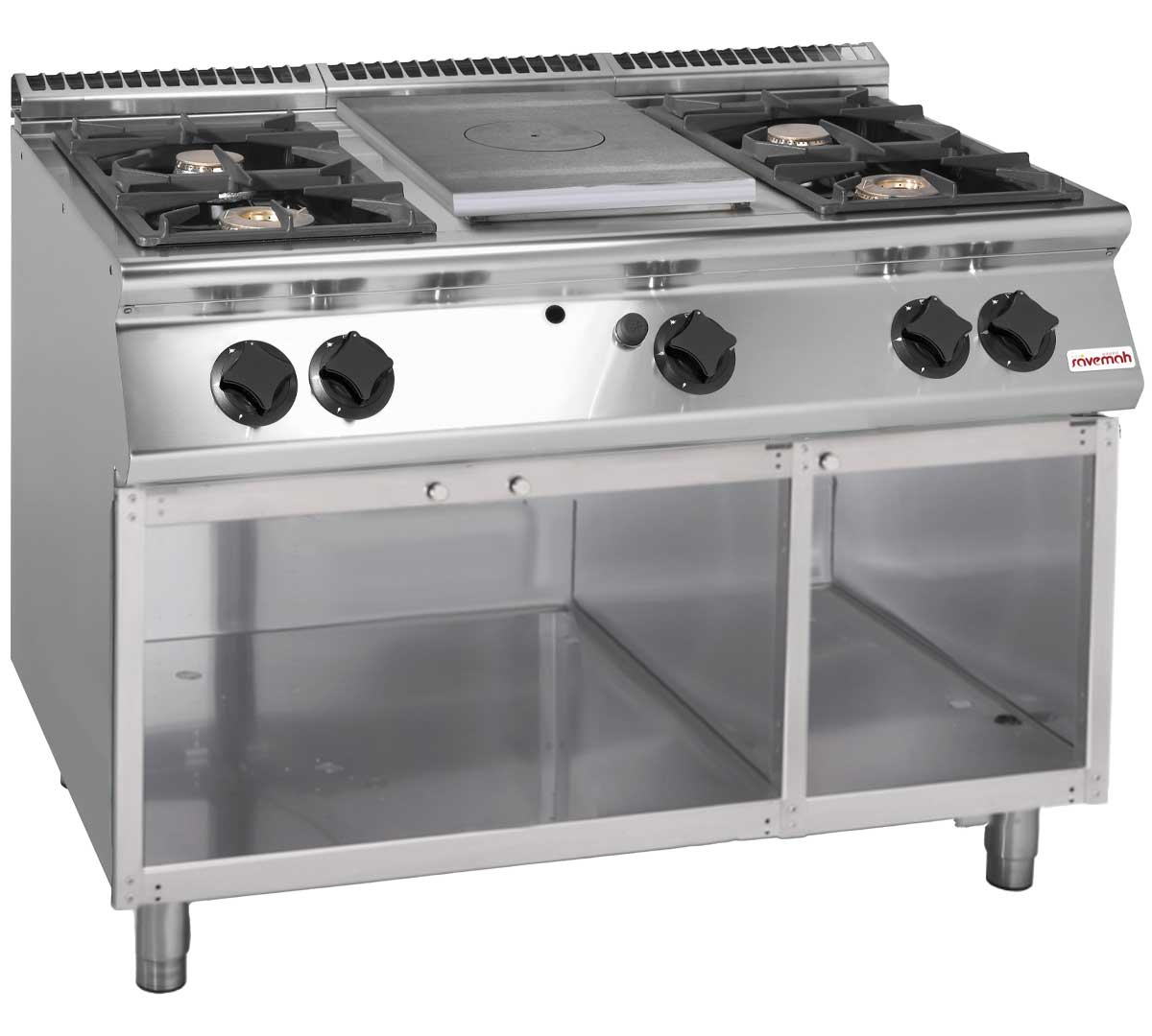 La Cocina S900 Placa Radiante + 4 Fuegos con Mueble Abierto Savemah es una solución robusta y eficiente para cocinas profesionales que buscan máxima potencia y durabilidad en un solo equipo.
