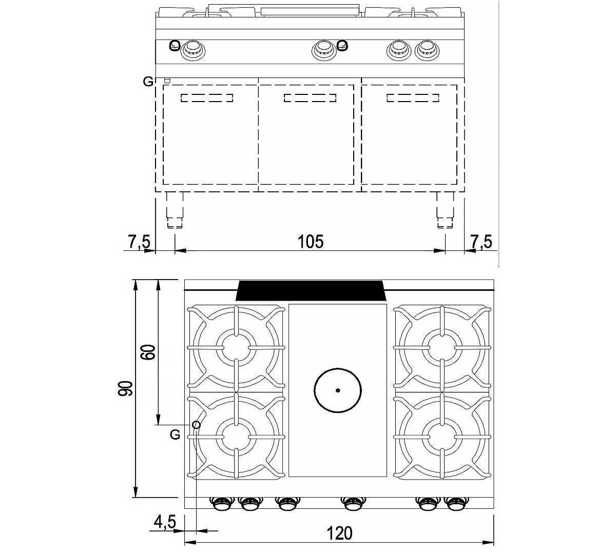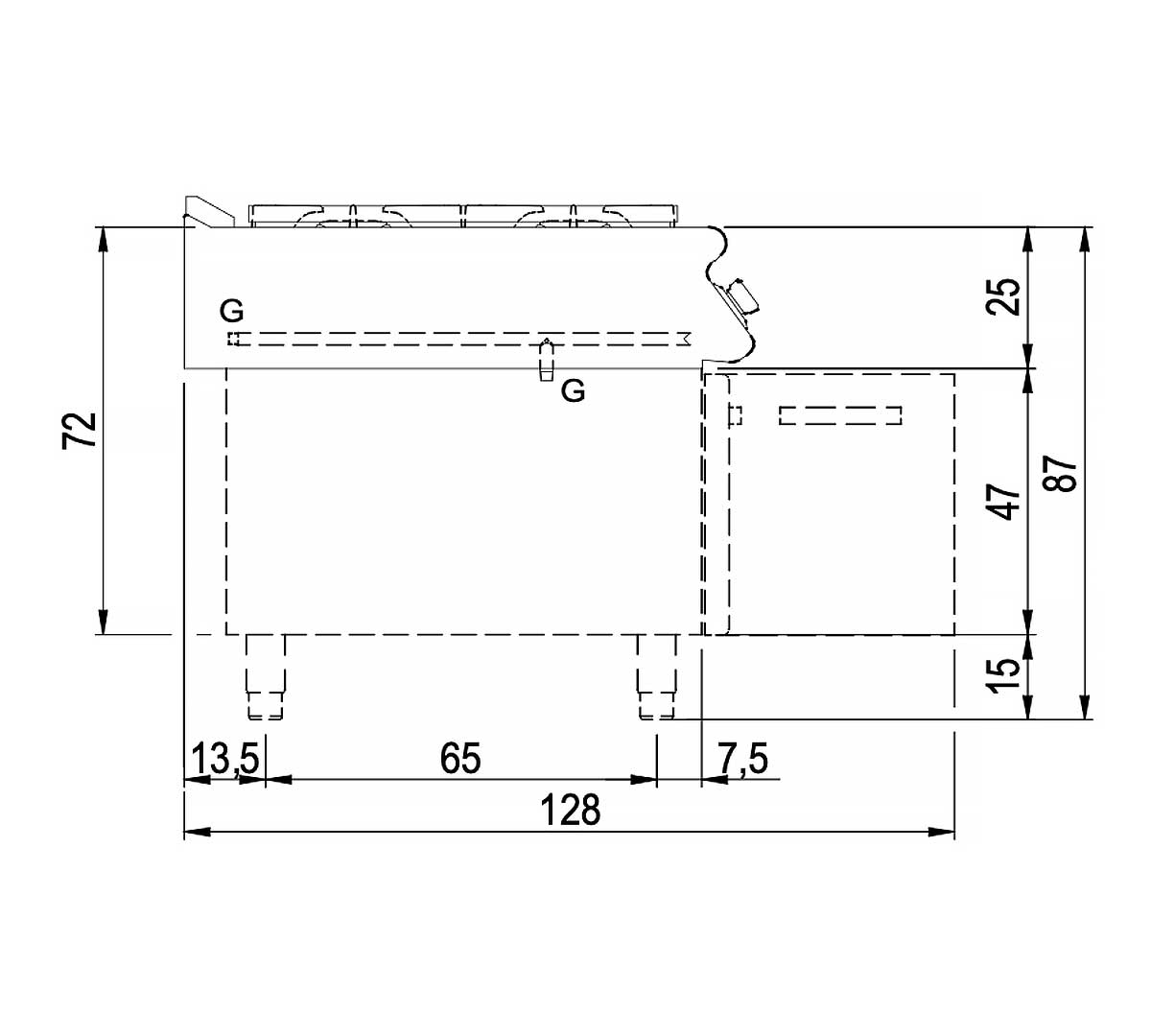Cocina modular de gas con placa radiante de gran espesor. Con cuatro fuegos y sistema de seguridad por termopar. Fabricada en acero inoxidable AISI 304.