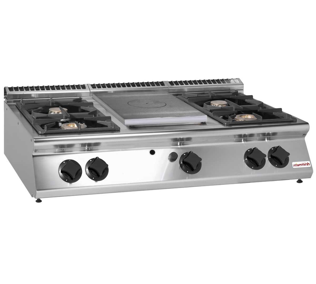 La cocina Savemah SV 912 TPPCG2B-T combina la eficiencia de una placa radiante central con la versatilidad de 4 fuegos a gas de alta potencia. Su estructura sólida y su diseño modular garantizan un funcionamiento constante, preciso y fiable incluso en los servicios más exigentes.