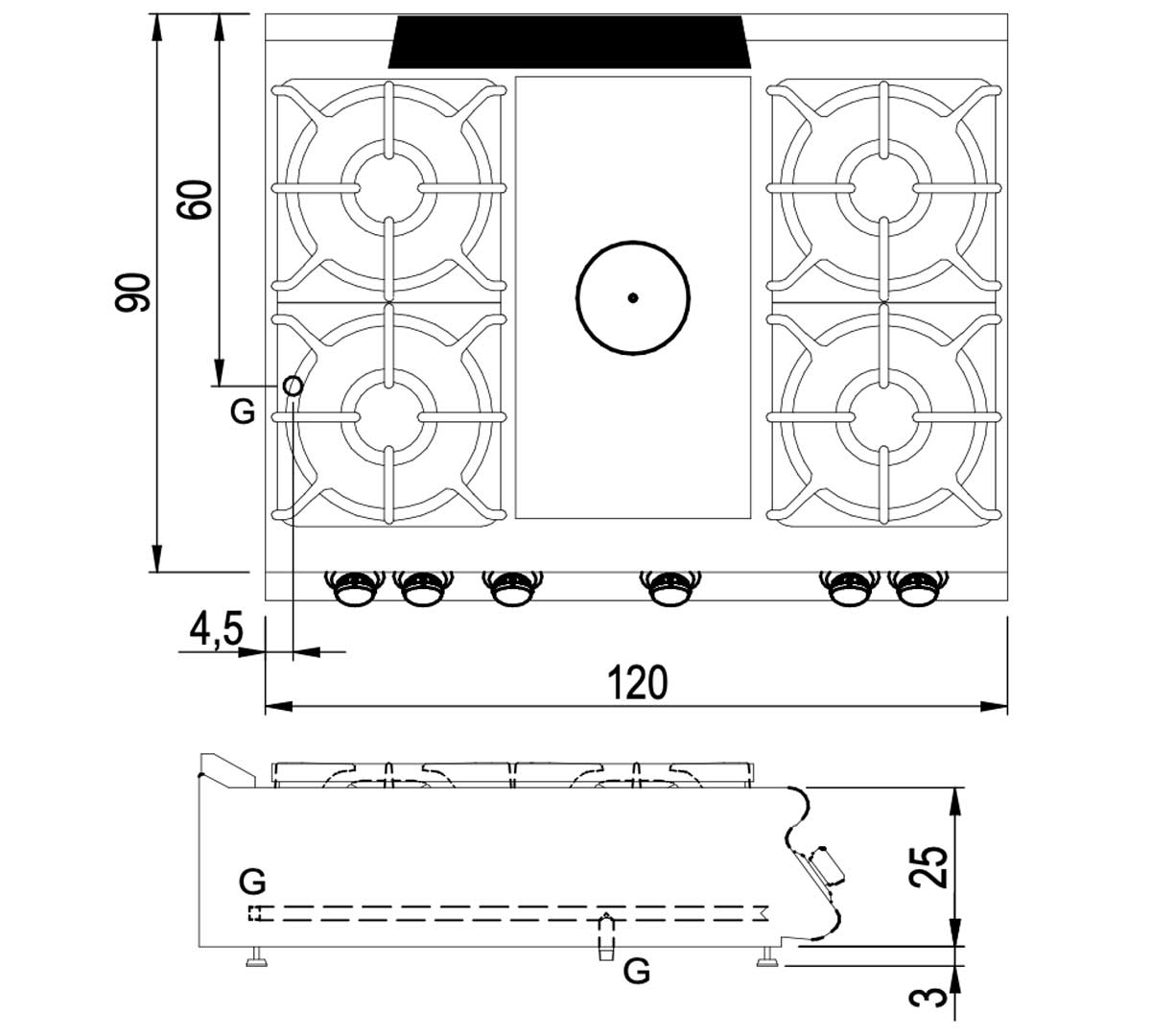 La Cocina SV 912 TPPCG2B-T pertenece a la Serie 900 Modular, con encimera de acero inoxidable AISI 304 de 2 mm, 4 quemadores a gas y una placa radiante de hierro fundido de grosor reforzado con orificio central, alimentada por quemador multianillo de 12 kW.