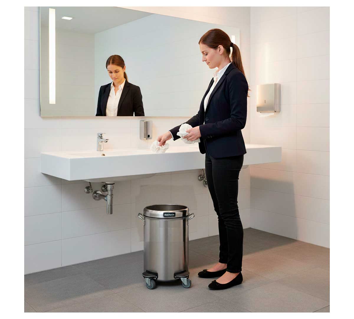 Cubo de basura para almacenar o transportar desperdicios fabricado en acero inoxidable. Tiene dos asas, tapa independiente y 3 ruedas con un diámetro de 5 cm.