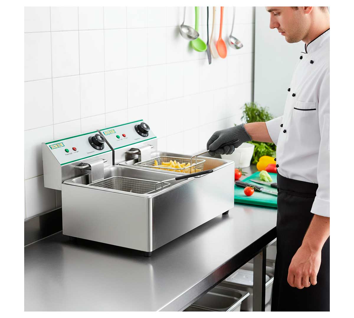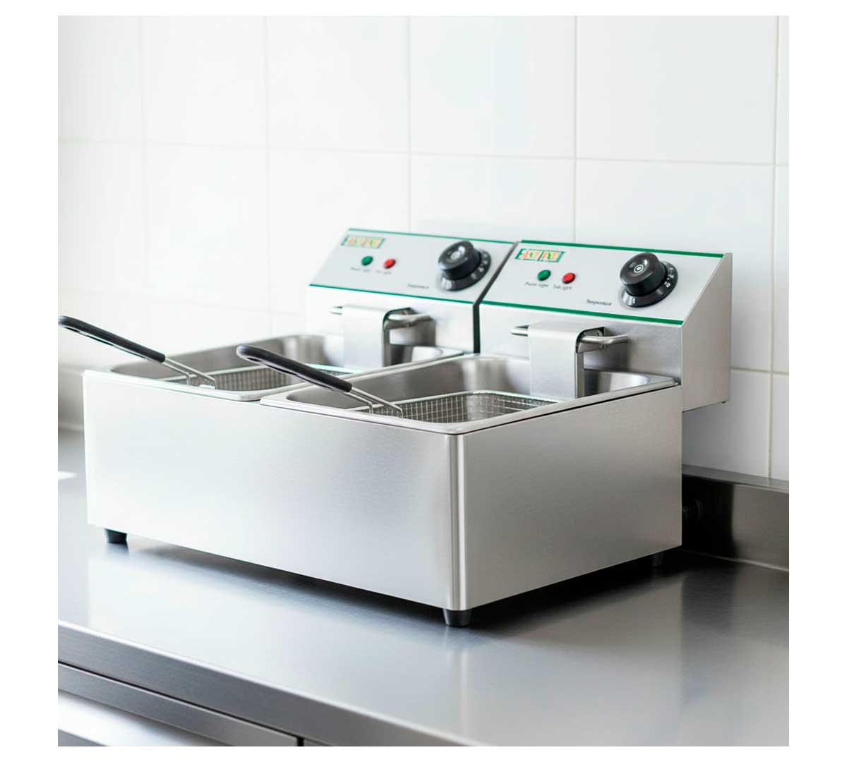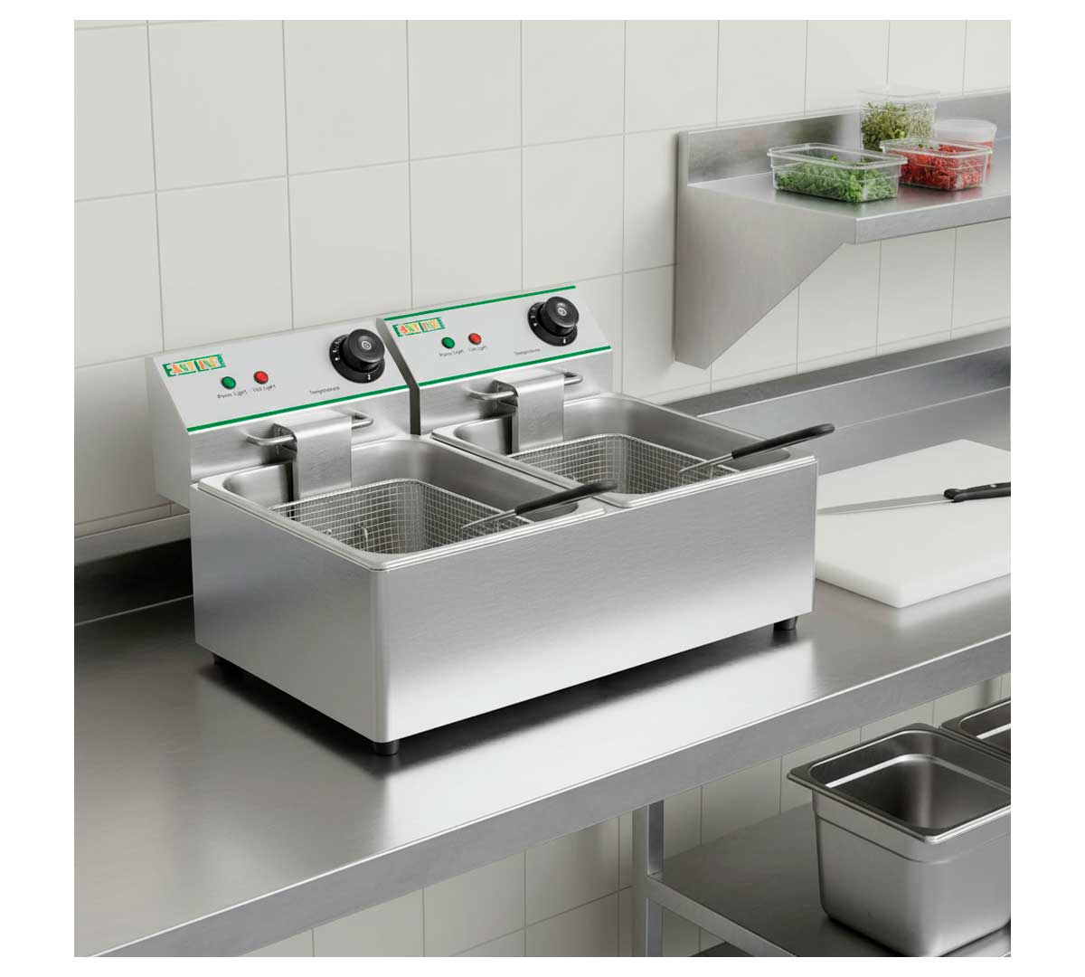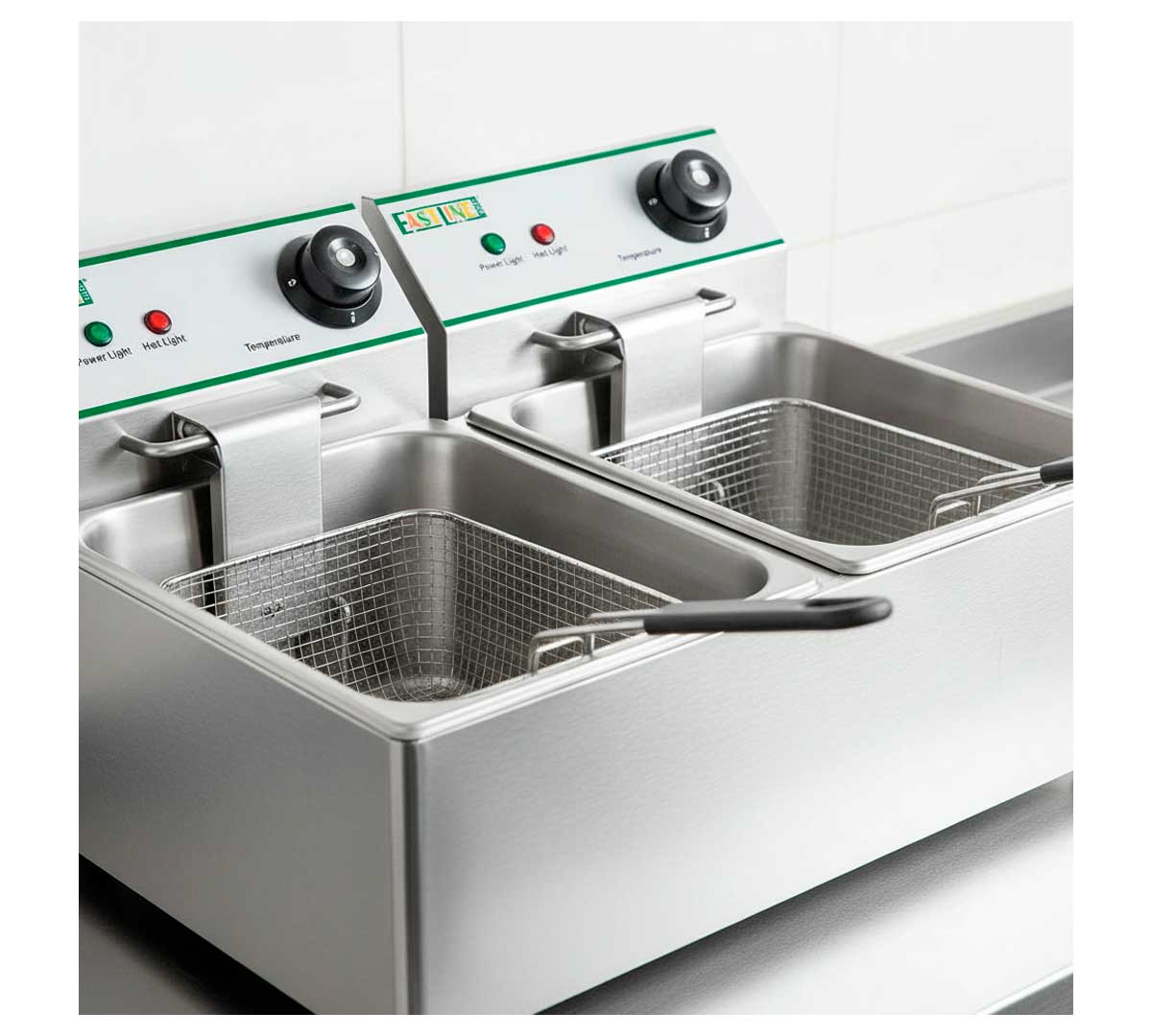 Freidora eléctrica de sobremesa. Tiene 2 cubas con resistencias de acero inoxidable y doble termostato de uso independiente. Incluye cesta. Está disponible en 2 modelos.