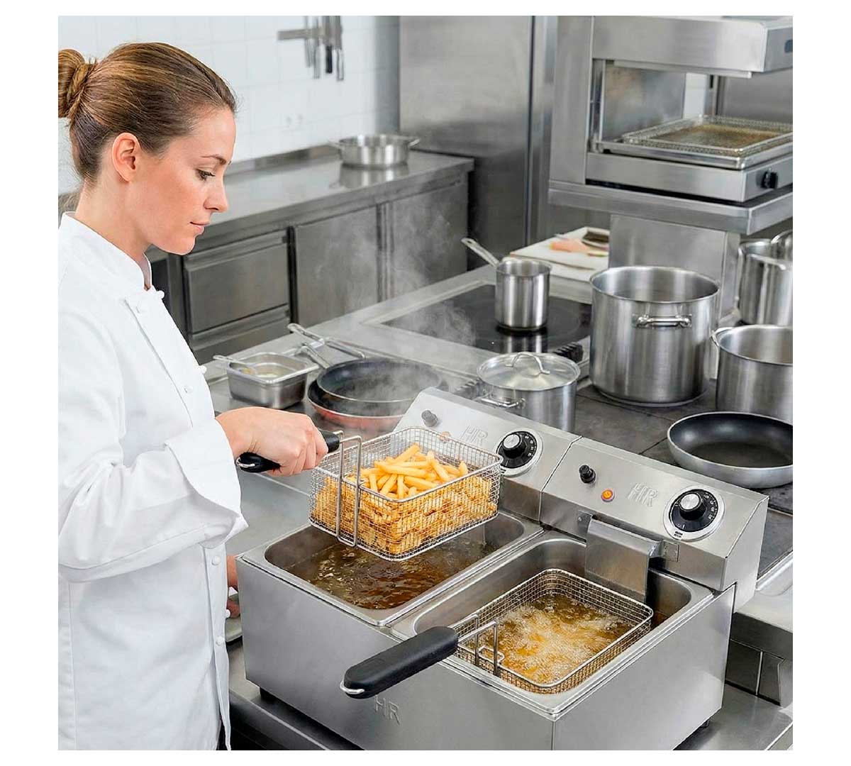 Freidora eléctrica de sobremesa. Tiene 2 cubas de 6 litros. El fondo mide 36 cm. Equipada con un termostato de trabajo regulable hasta 195 ºC y un contactor de 20 A. Incluye cesta.