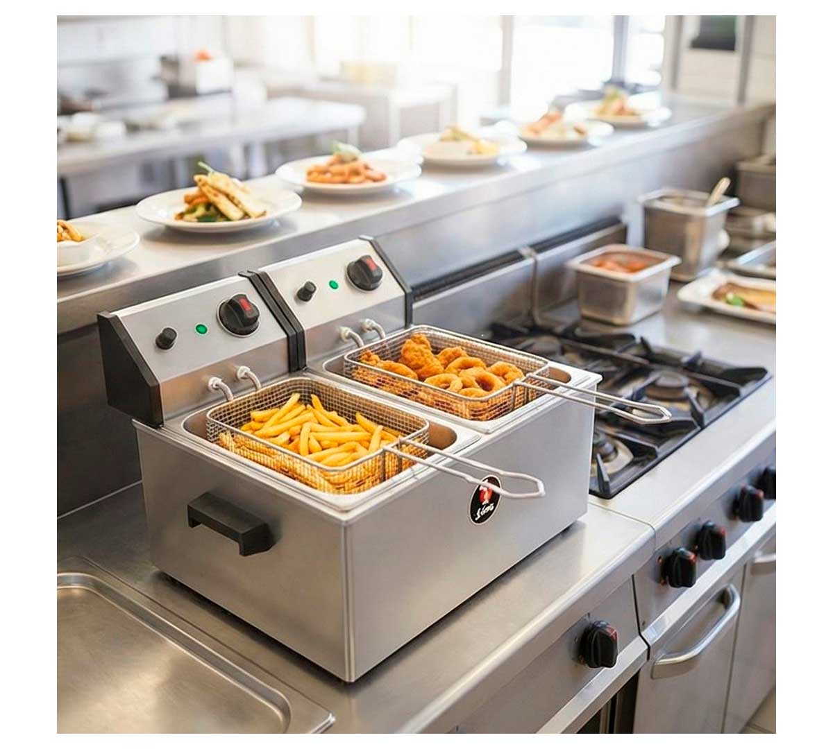 Freidora doble construida en acero inoxidable, con termostato de temperatura y seguridad. Dispone de una zona fría para depósitos de residuos que permite una fritura variada sin alterar los sabores. Incluye tapa y cesta.