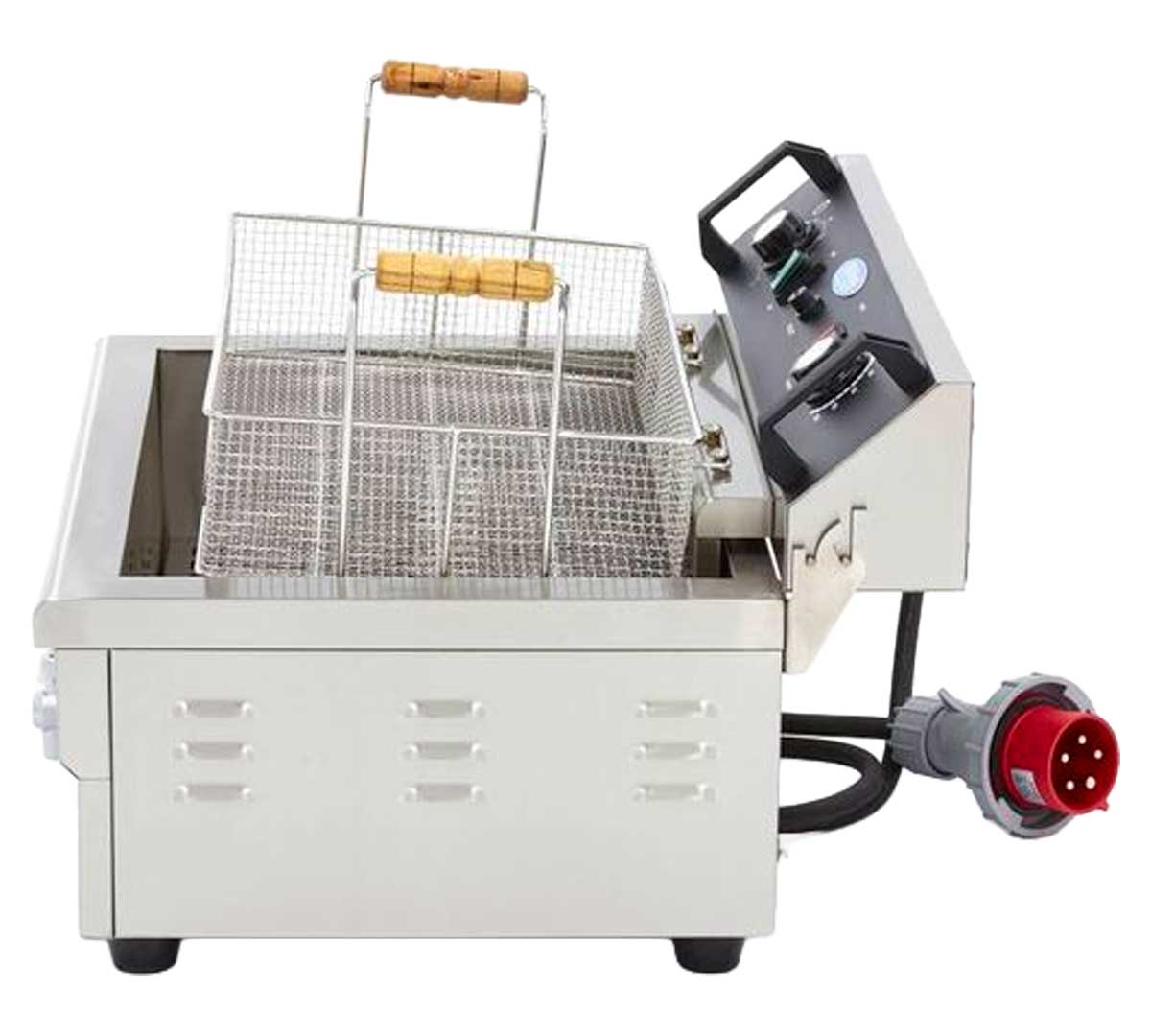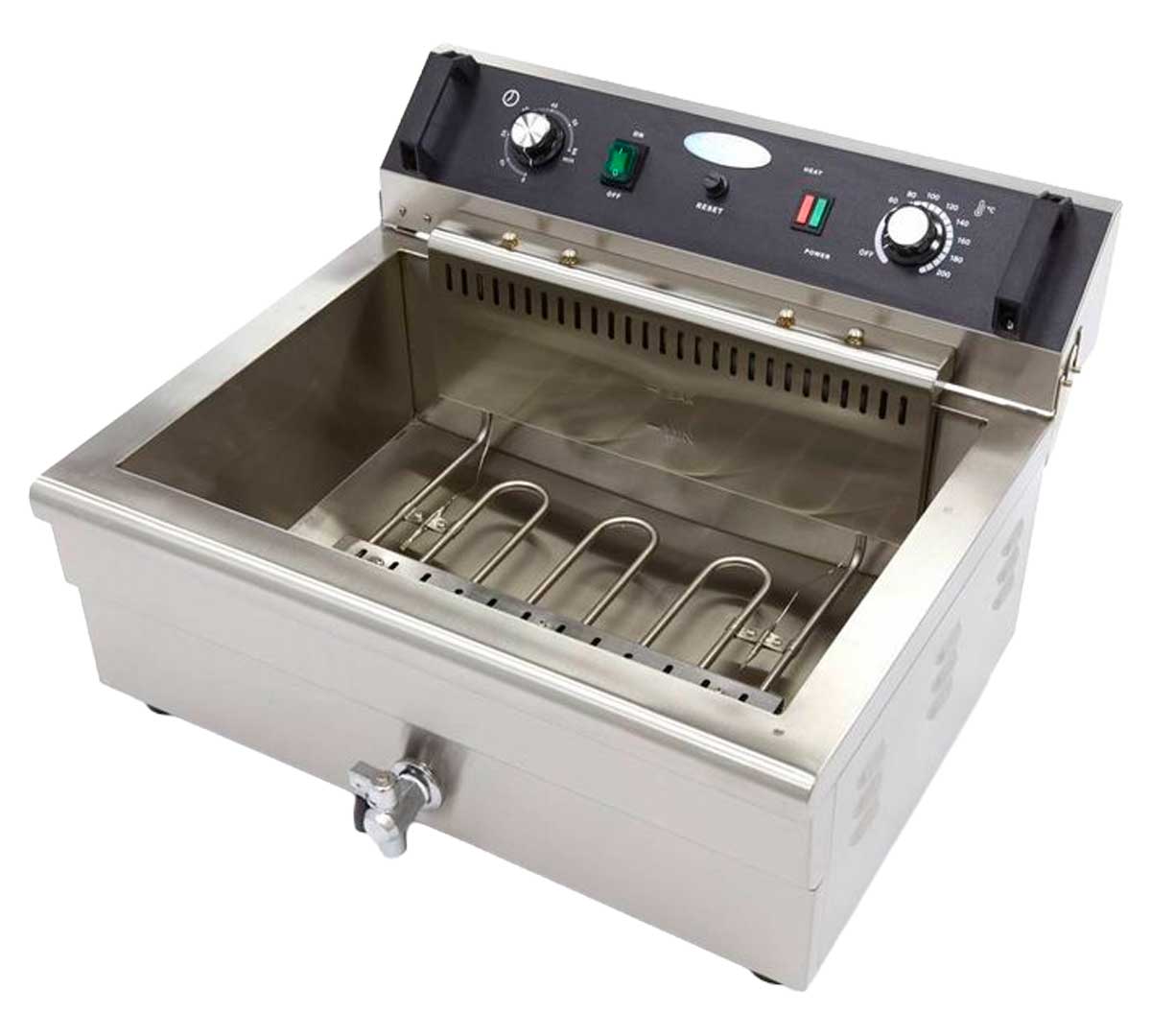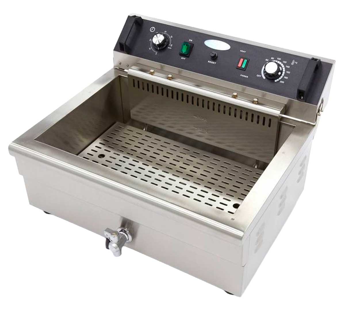 Freidora eléctrica de cuba única con grifo de vaciado, fabricada en acero inoxidable, capacidad máxima de 20 litros de aceite y control de temperatura regulable hasta 200 °C.