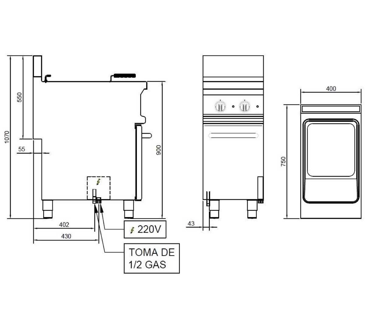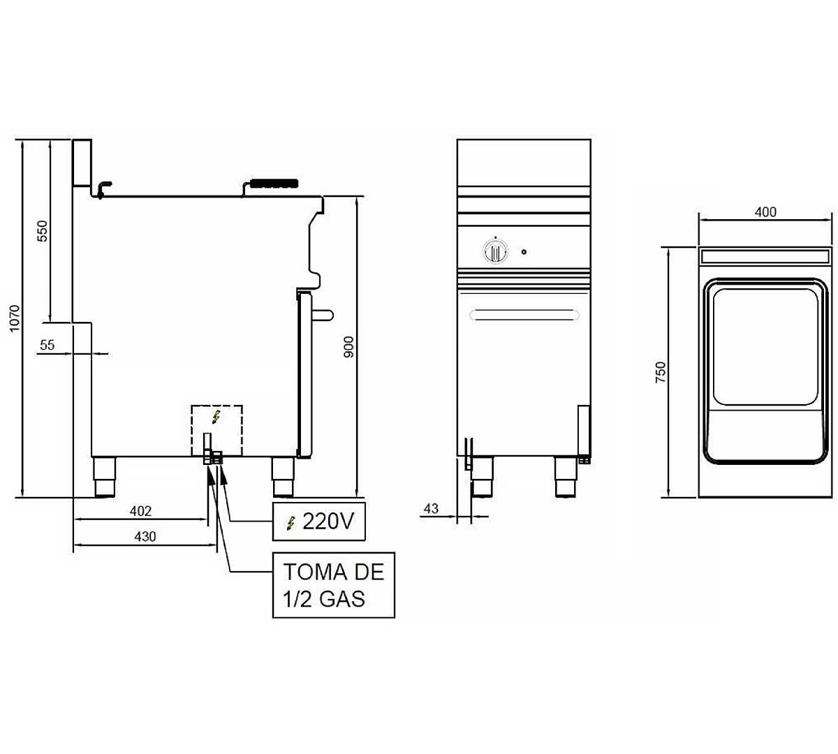 El control de temperatura actúa entre 90 °C y 185 °C mediante válvula termostática 820 NOVA, con un termostato de seguridad adicional fijado a 230 °C. El encendido piezoeléctrico requiere alimentación eléctrica 220 V I + N + T. El intercambiador de calor situado fuera de la cuba favorece un calentamiento uniforme desde el nivel inferior del aceite, mejorando el rendimiento y reduciendo el consumo.