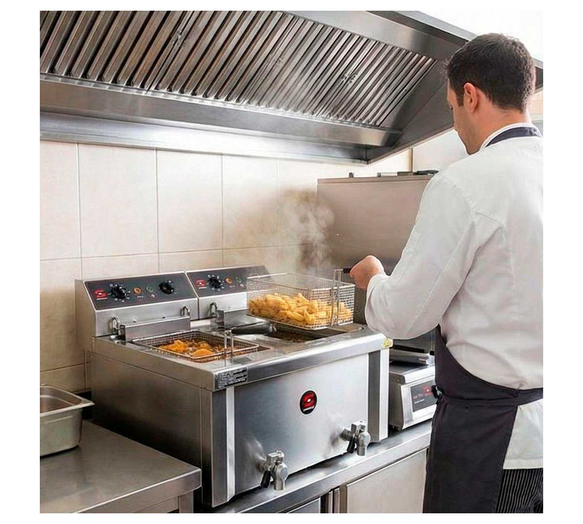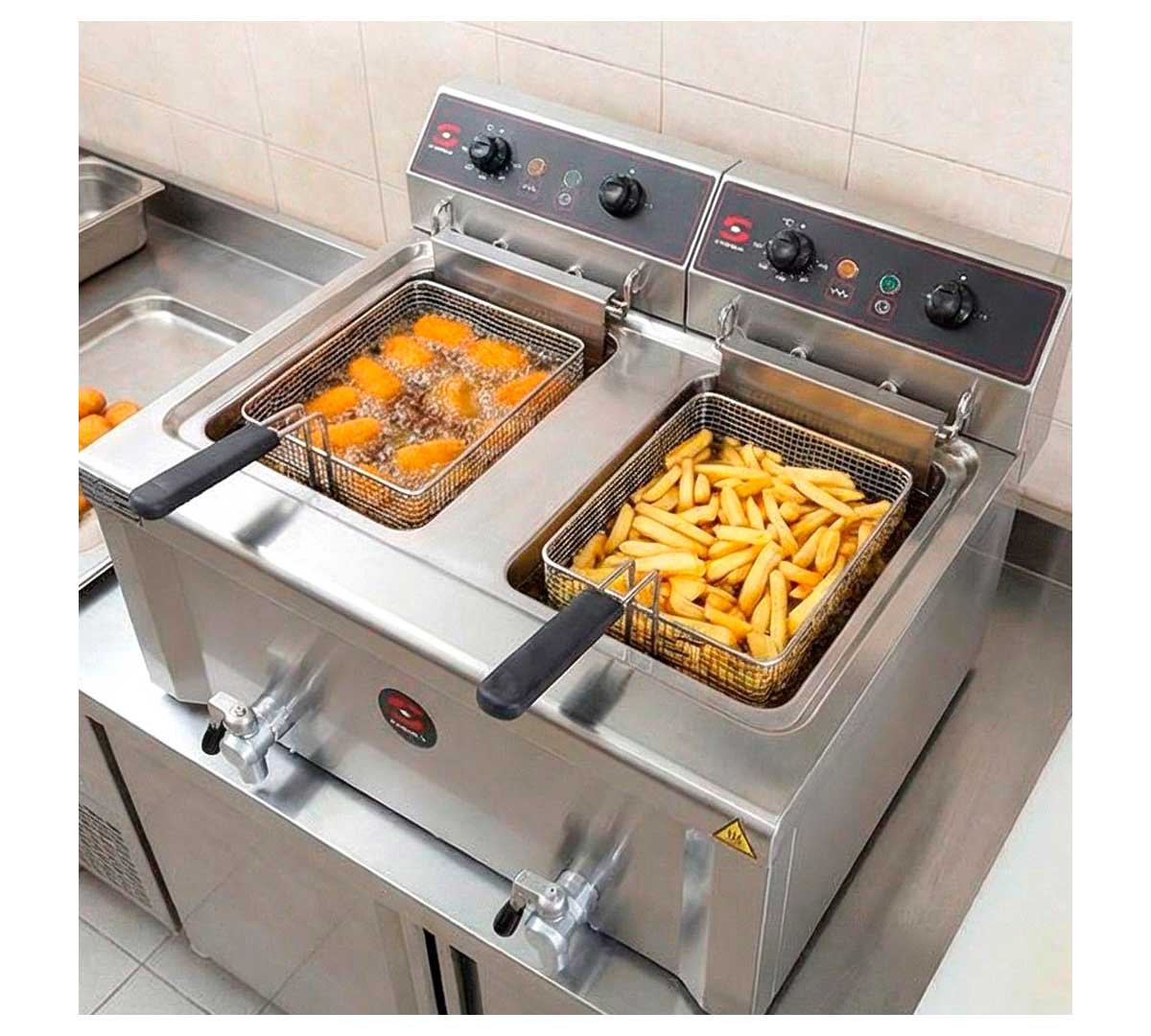 Freidora eléctrica de sobremesa con 2 cubas soldadas. Dispone de grifo de vaciado. Equipada con 2 cestas y termostato de seguridad. Está disponible en 3 modelos.