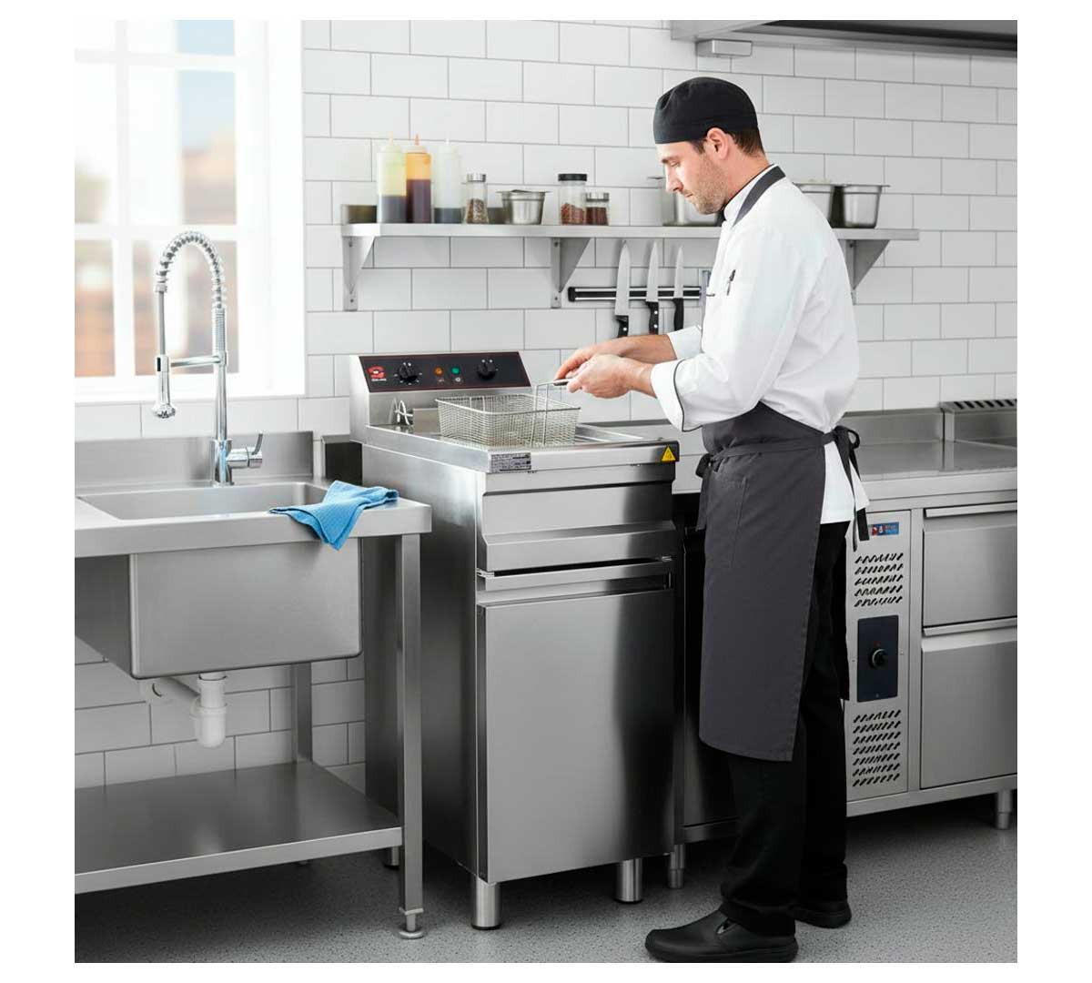 La freidora FE-15 es un modelo de pie con cuba soldada y provista de grifo de vaciado. La cuba tiene una capacidad de 15 litros.