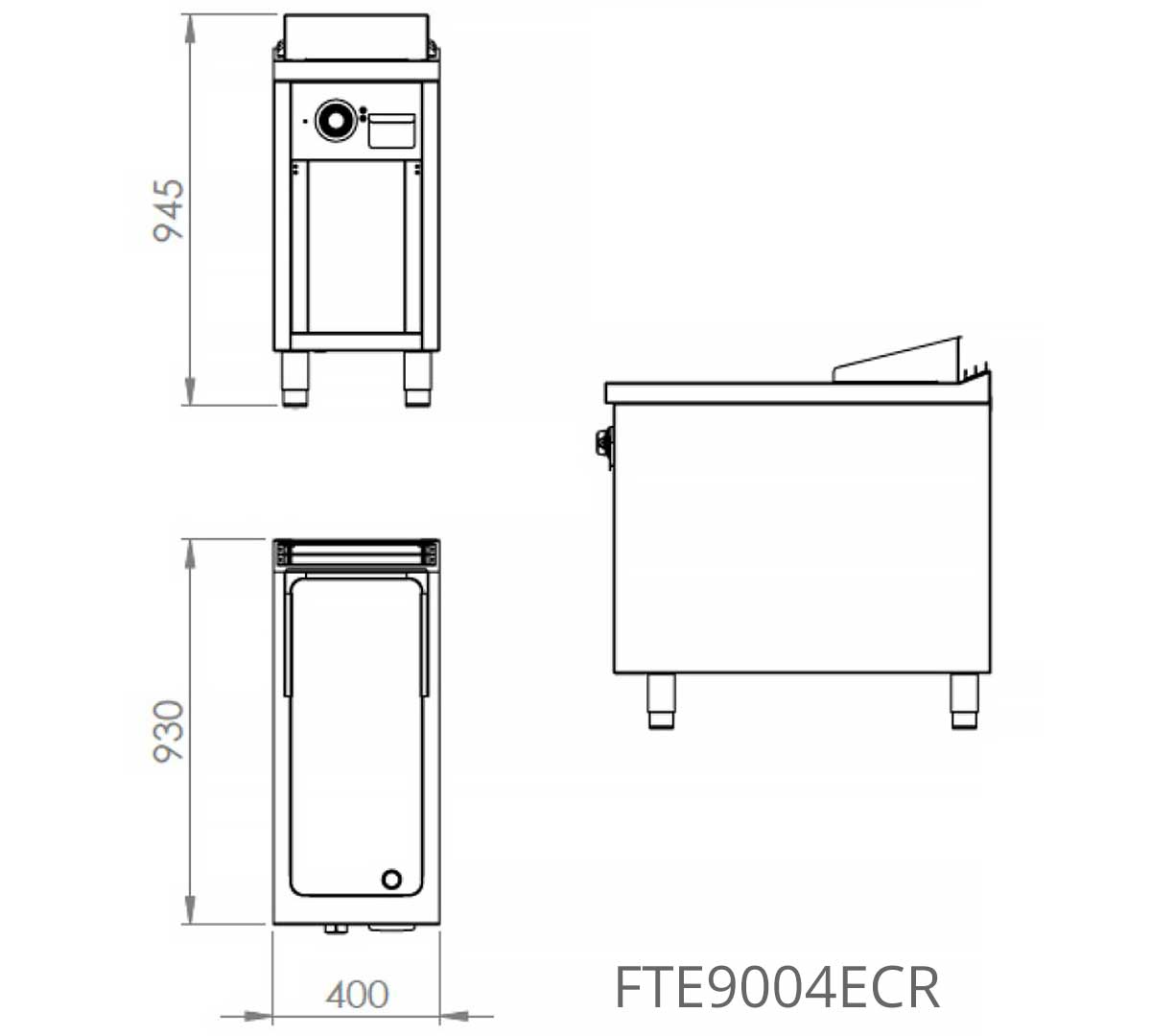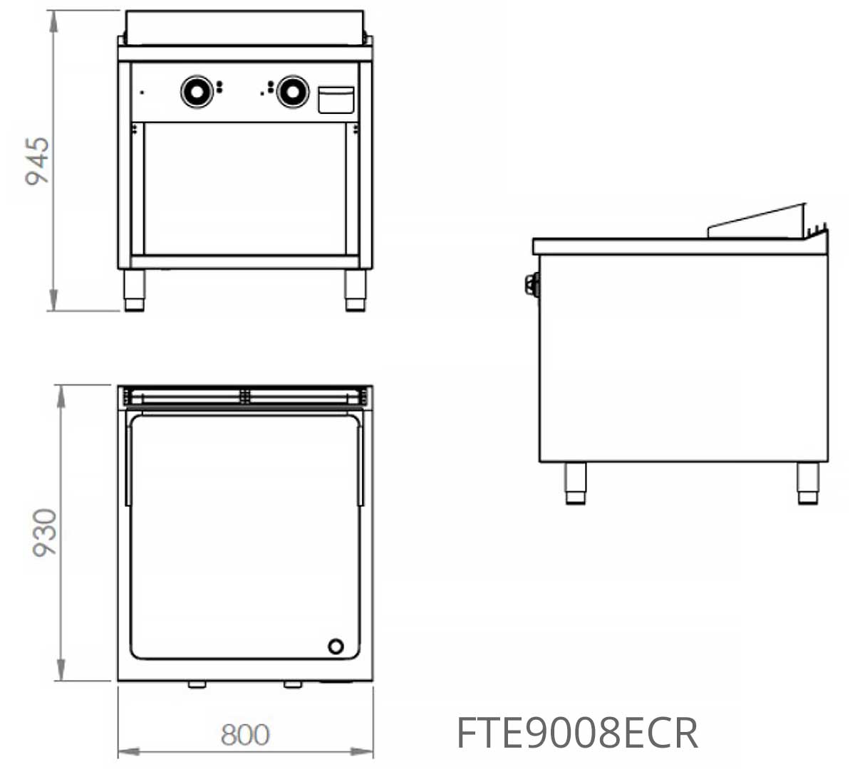 Los modelos FTE9004ECR y FTE9008ECR pertenecen a la Serie 900 modular, con palastro de 15 mm en cromo duro, encimera AISI 304 y fondo unificado de 900 mm que facilita la integración con otros equipos profesionales.