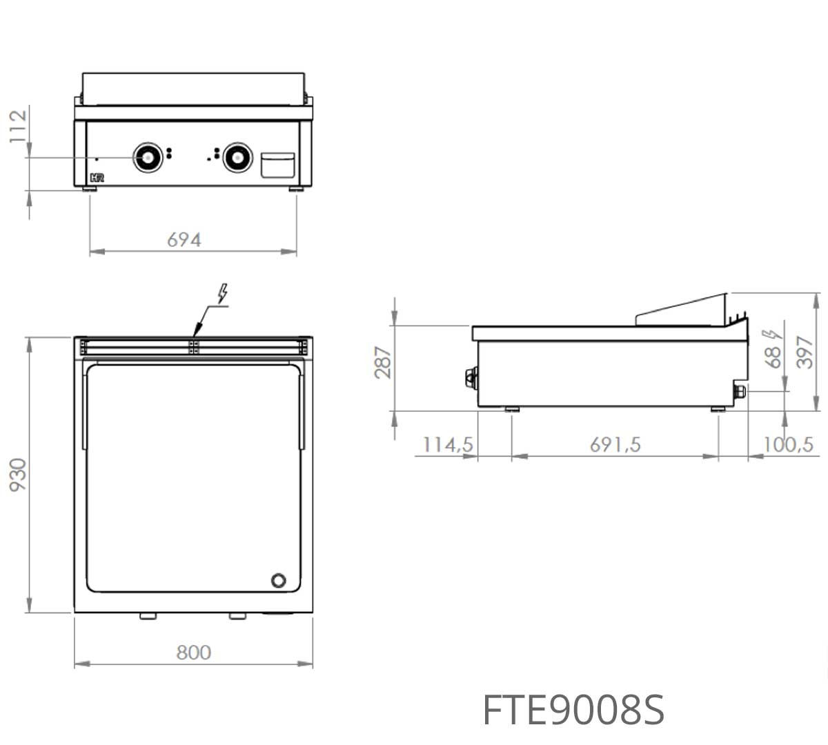 Los modelos FT9004S y FT9008S pertenecen a la Serie 900 modular, con palastro rectificado de 20 mm, encimera AISI 304 y fondo de 900 mm que asegura integración en cocinas industriales de alto nivel.