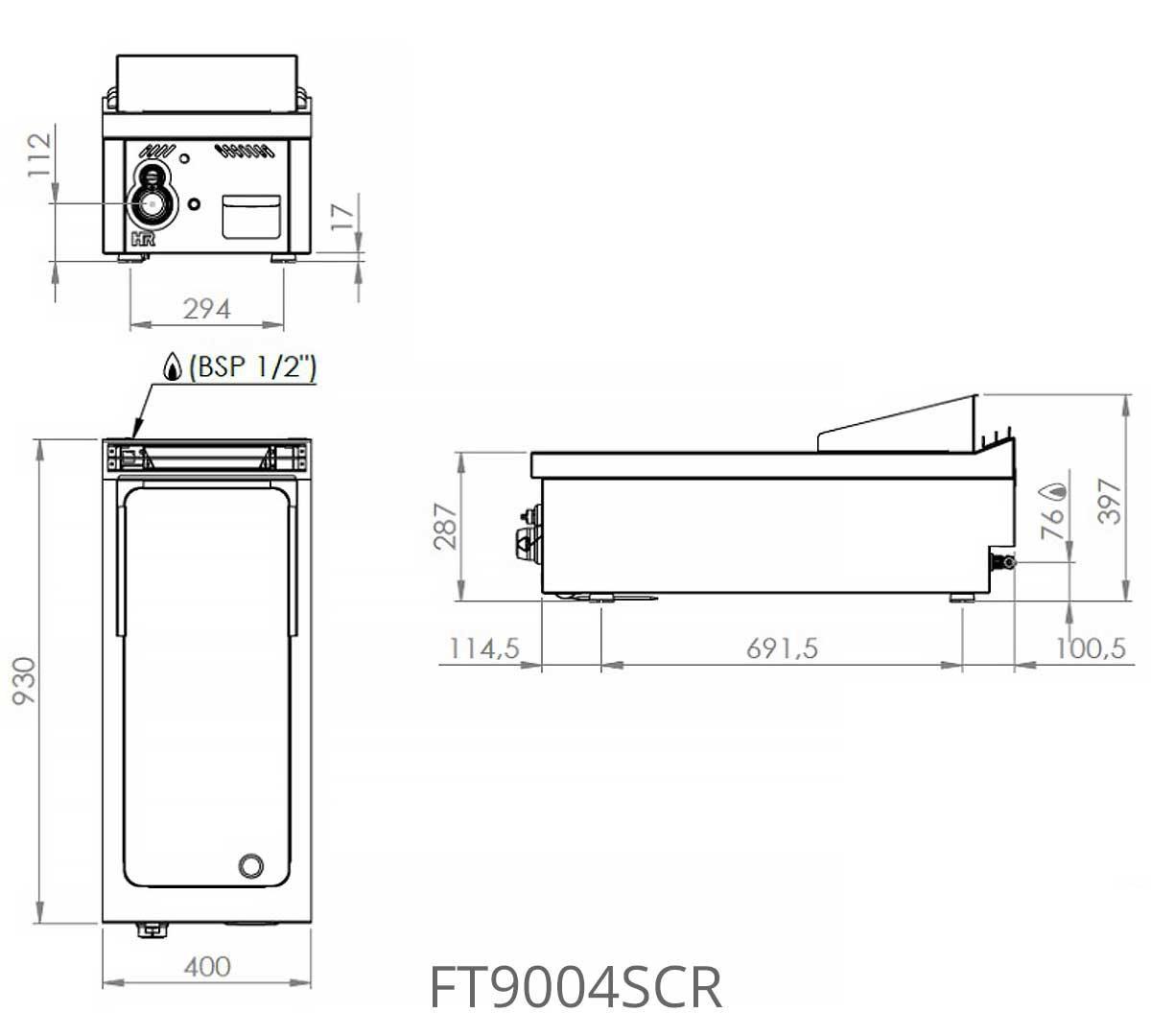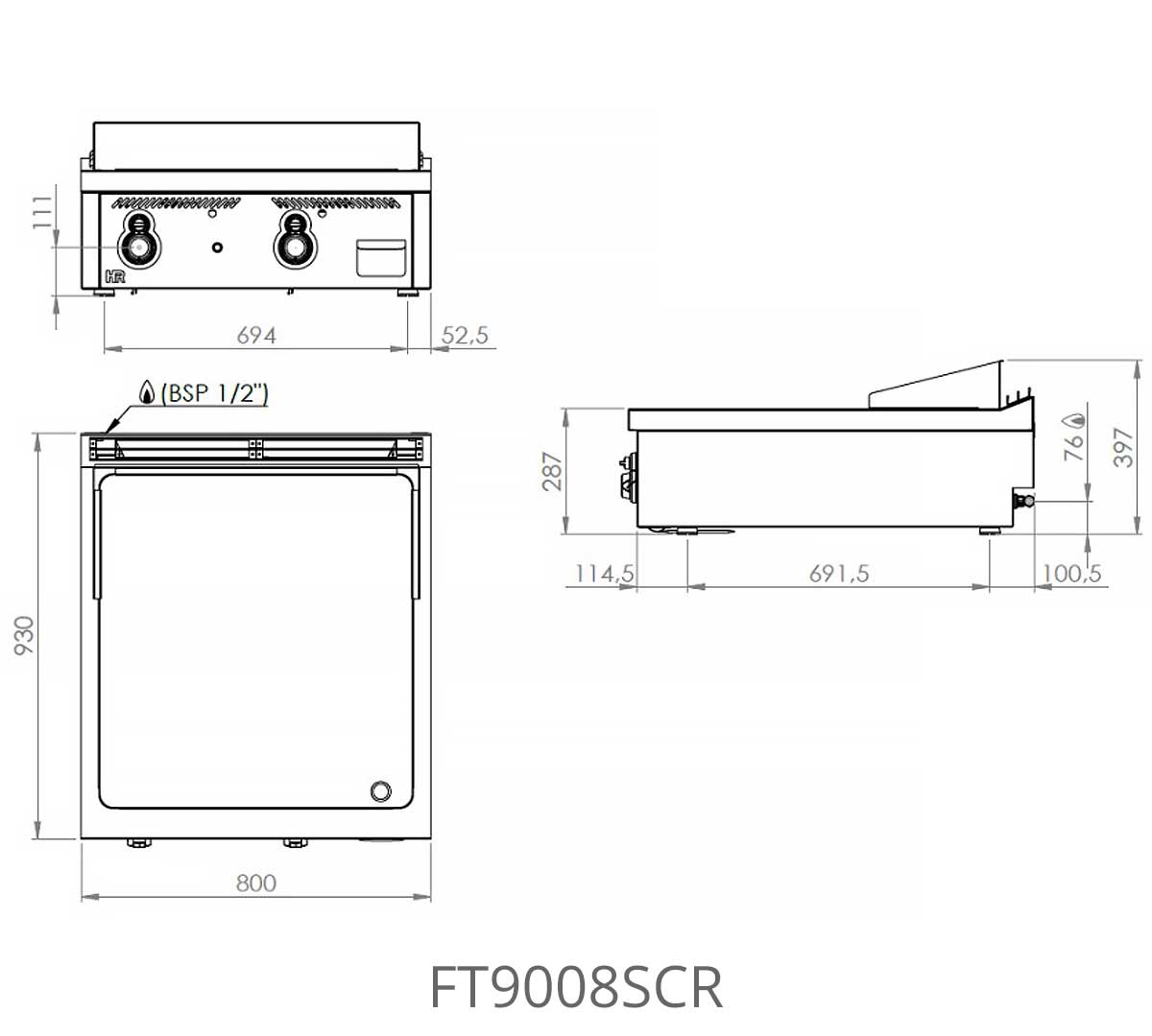 Los modelos FT9004SCR y FT9008SCR forman parte de la Serie 900 modular, con palastro en cromo duro de 20 mm, encimera embutida en acero inoxidable AISI 304 y fondo unificado de 900 mm para integración con otros equipos profesionales.