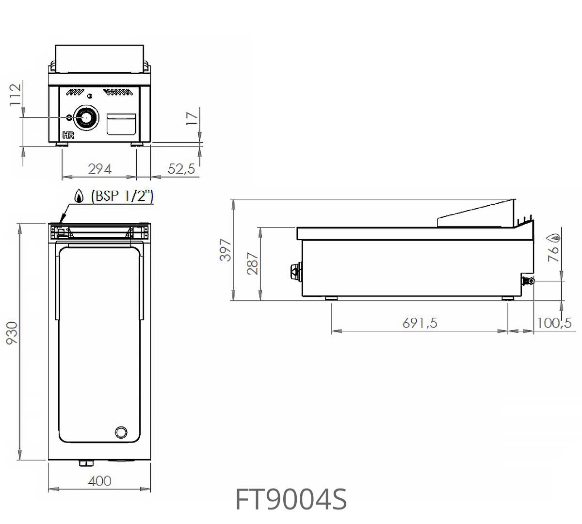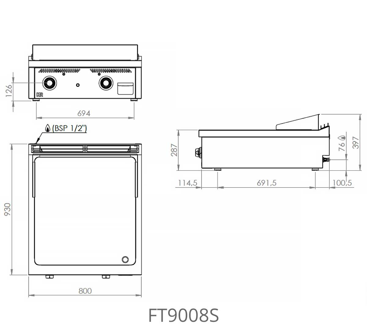 Los modelos FT9004S y FT9008S forman parte de la Serie 900 modular, con palastro rectificado de 20 mm, encimera AISI 304 y fondo unificado de 900 mm que asegura integración con otros módulos profesionales.